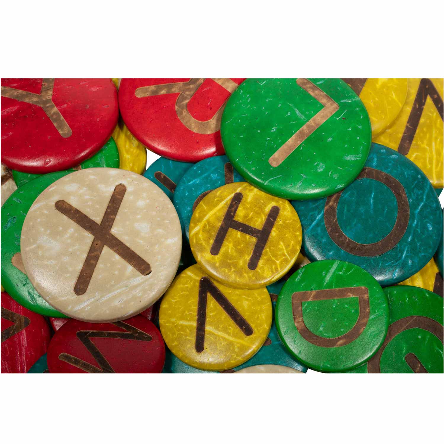 Brightly colored, coconut shells offer a natural way to learn uppercase letters. Use these tactile pieces for hands-on literacy activities including letter recognition and alphabet sounds. Because Coconut Letters are made from coconut shells, they are naturally very strong and durable. Great for indoor and outdoor use. Also perfect for loose parts play!