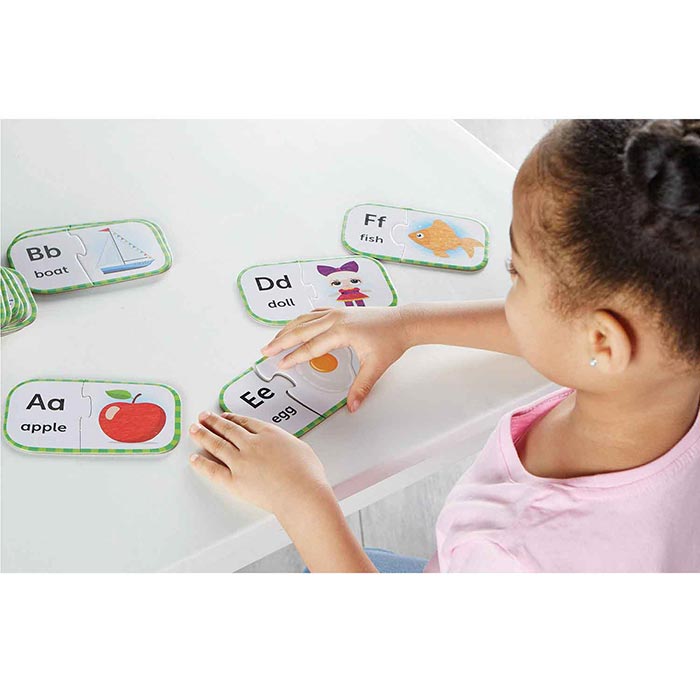 Get your children learning and playing with the ABC Puzzle Cards! This self-correcting puzzle set helps children master early alphabet and language skills. Bright images match the beginning letters and words on the puzzle pieces. Sturdy, reusable box doubles as a storage container. 26 two-piece puzzles per set.