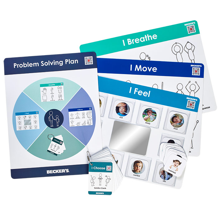 Visual Toolkit & Training Collection: four 10” x 13” posters on laminated cardstock (Problem Solving Plan, I Feel, I Breath, I Move), Solution Card Set, and Teacher Training Video Library. Each visual resource includes a QR code linked to a training video demonstrating how to introduce and integrate these tools into your classroom.