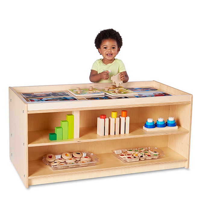 This innovative double-sided storage unit solves the problem of where to safely display photos and pictures so that children can easily view them. The large surface area on the top of the unit can be filled with pictures that are protected by a clear acrylic panel. A teacher can remove the panel and replace the pictures any time. The acrylic panel covers the top of the unit and has a finger-hole for easy removal. Unit features exposed hardware.