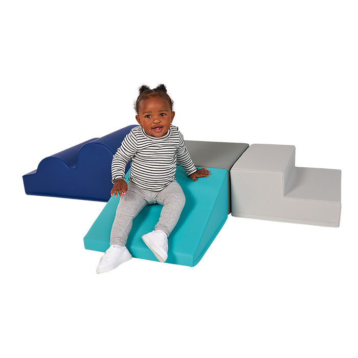 Encourage active play with Becker's Trailblazer Summit in gray. This climber features various components such as steps, a bumpy ramp, a cube, and a slide. This set provides hours of enjoyment while helping children develop their gross motor skills.