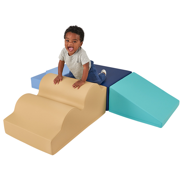 Encourage active play with Becker's Trailblazer Summit in navy. This climber features various components such as steps, a bumpy ramp, a cube, and a slide. This set provides hours of enjoyment while helping children develop their gross motor skills.