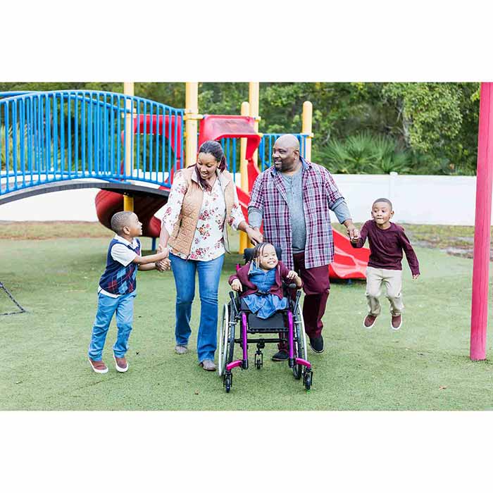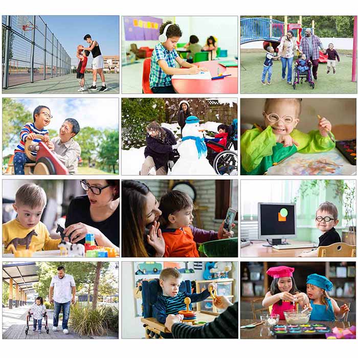 Colorful posters showing children with different abilities with their friends and families doing everyday activities.