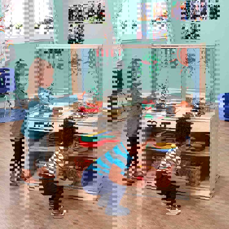 Let the sunshine in! This double-sided play kitchen makes toddlers feel right at home. The kitchen-themed, clear dividing panel provides safe distancing for your cooks Crafted from Baltic Birch plywood with acrylic window panel Modern conveniences include an oversized stainless steel sink, pretend water dispenser and chrome faucet.
