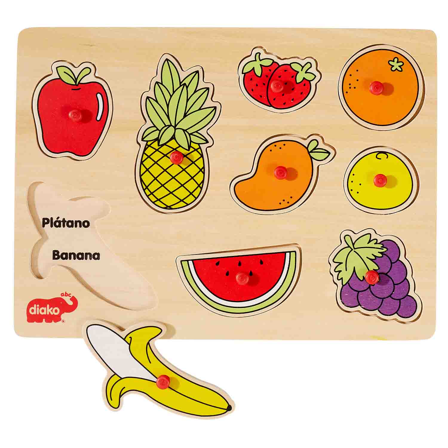 Fun, durable, bilingual peg puzzles. Lift each colorful wooden shape to reveal both Spanish and English names!