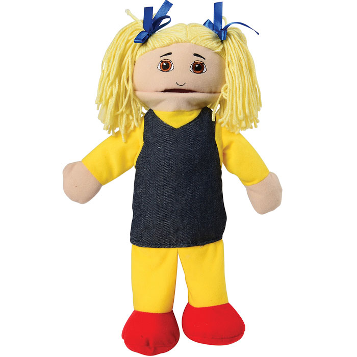 With embroidered faces, yarn hair and movable mouths, these Caucasian family puppets are dressed for school and work.