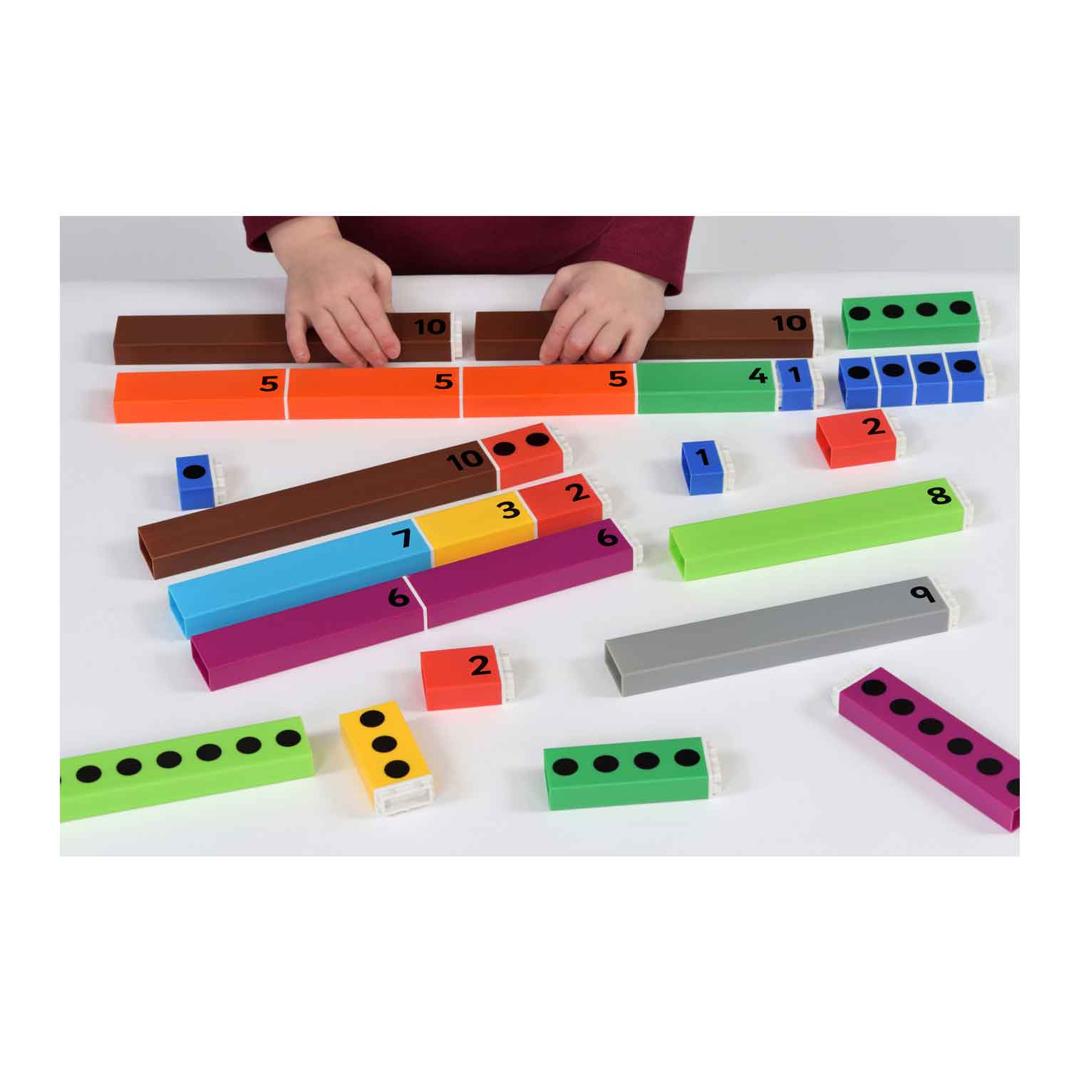 These rods are numbered 1-10 with a number on one side and a corresponding number of dots on the other. Each one is color coded to represent a number, and the chunky pieces appeal to young learners. The 20 cards each have a math problem on the front and the answer with images of the connecting number rods on the reverse.