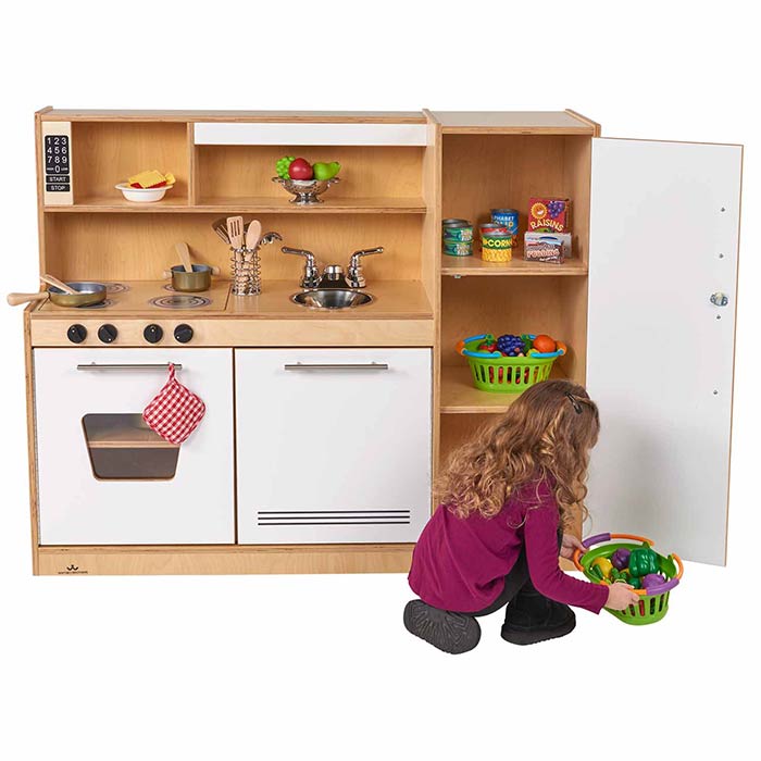 This compact all-in-one kitchen combo features a unique contemporary design, cabinet handles in matte chrome finish, knobs that “click” and realistic details that will inspire hours of imaginative play. Includes an integrated stove, sink, refrigerator and hutch. Safety features include smoothed edges, eased corners and doors with top-to-bottom continuous hinges to prevent little fingers from getting pinched.