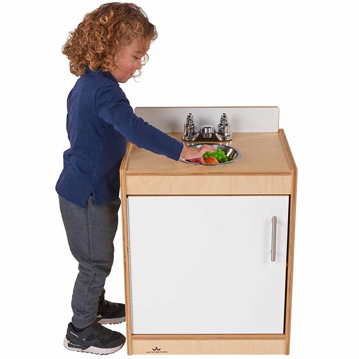 Just like home! Our modern sink is full of delightful character with a unique contemporary design, cabinet handles in matte chrome finish, knobs that click, realistic printed keypad, and warm white accents that will inspire hours of imaginative play for preschoolers. Top-to-bottom continuous hinges on the doors prevent little fingers from getting pinched.