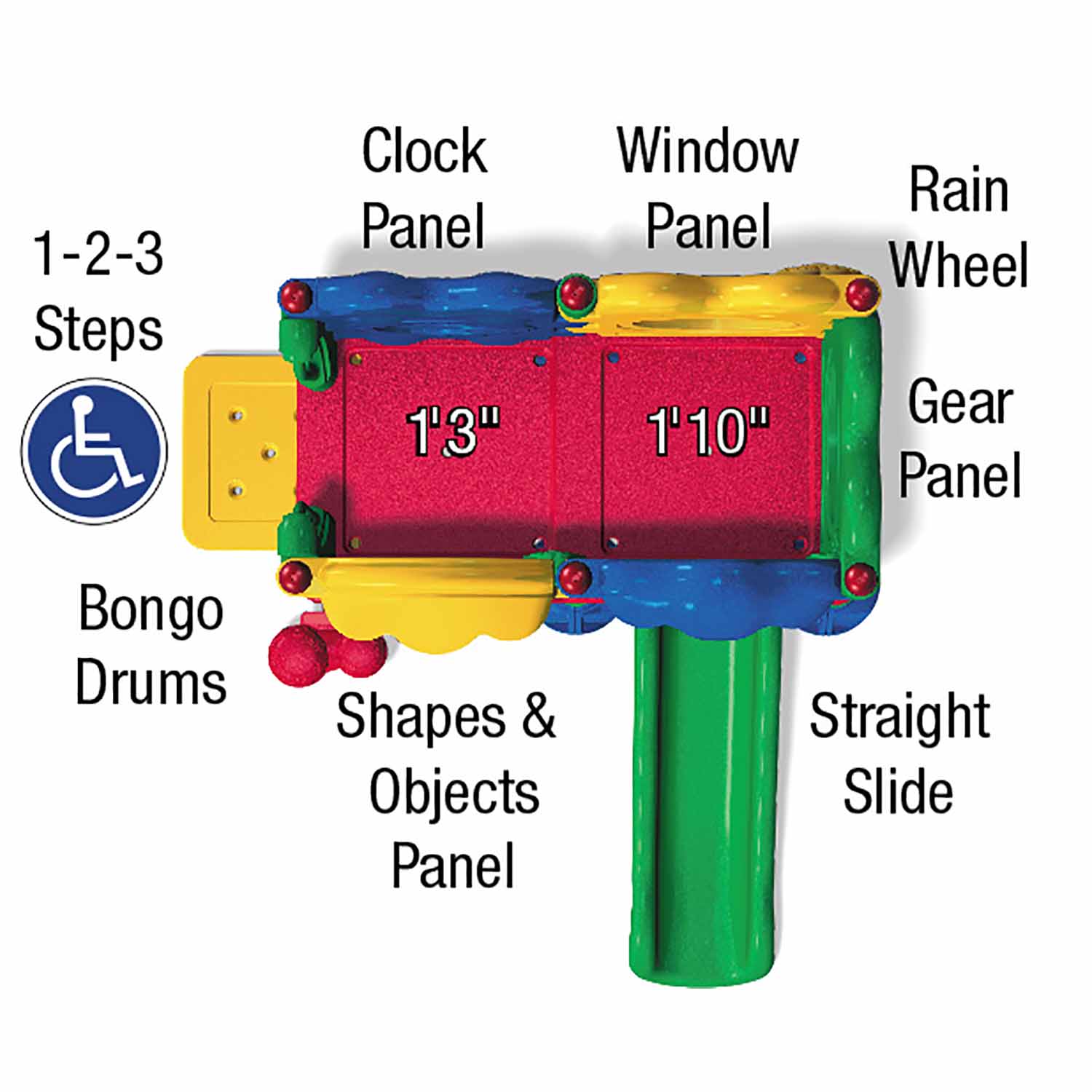 This two-deck structure features a multitude of activities for the youngest 6-month old to the busiest 23-month old, while offering nature inspired detail integrated throughout the structure. The window panel allows children to peek at their classmates below while the Rain Wheel and Gear Panel offer learning opportunities about cause and effect as they realize the noise they can make with a simple spin. The entryway of the structure also features handrails so children can enjoy an easy transition to the first deck.