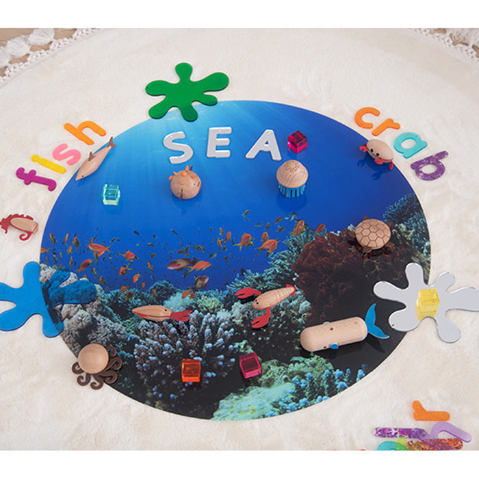 This colorful, semi-translucent sea-life playmat features a detailed image of a diverse coral reef with tropical fish. When placed against a light source, the image becomes even more vivid and engaging. Children will love using this playmat for sensory play and small world building, providing a colorful and imaginative backdrop for their playtime adventures. The mat fits perfectly in the Sensory Mood Discovery Table.