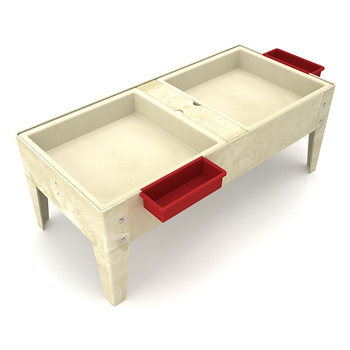 Great for indoor/outdoor use! This sensory table includes two 4” deep Mega-Trays that lift out for easy emptying. Also included are two snap-on caddies and a white plastic lid.