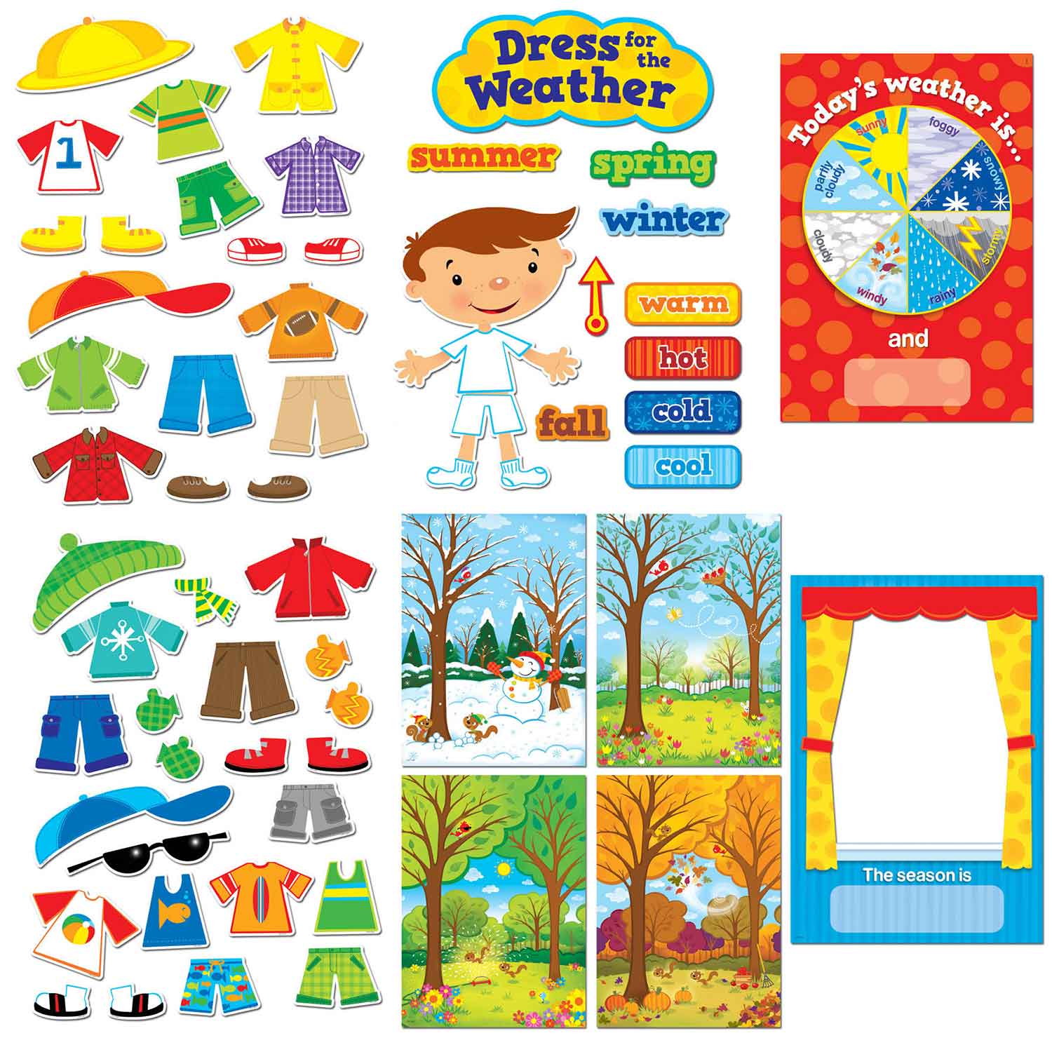 This 57-piece set contains 1 window (12" x 17½") and 4 seasonal scenes, a weather spinner, 4 season titles, 4 temperature words, 1 dress-up kid (8¾" x 13½"), and 41 pieces of clothing, shoes, and accessories. Perfect for use during circle time each morning.