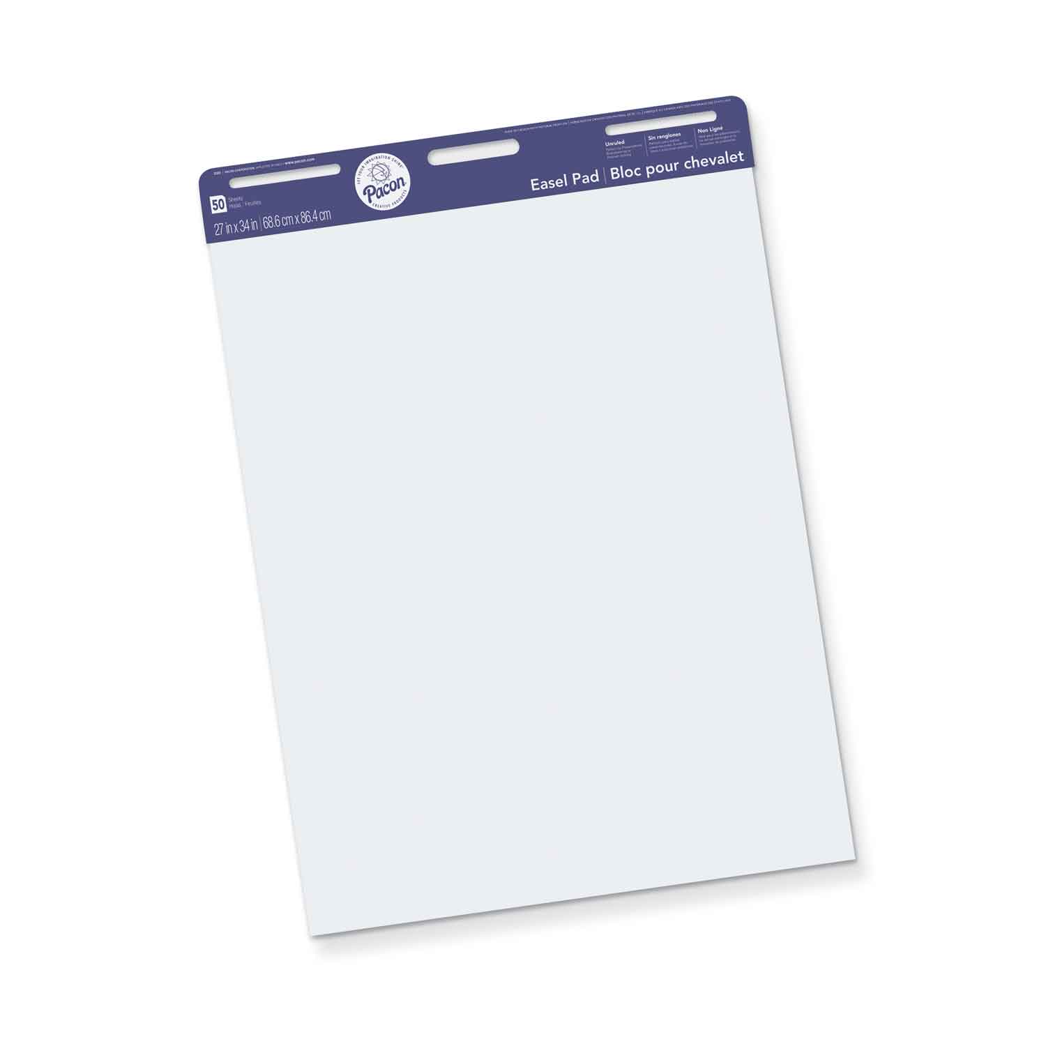 High quality 16# white sulphite bond ruled on one side. Each pad is perforated with headstrip and 3-hole punched for hanging. Contains 50 sheets per pad. Sheet size, 27" x 34". Recyclable. 4 per pack.