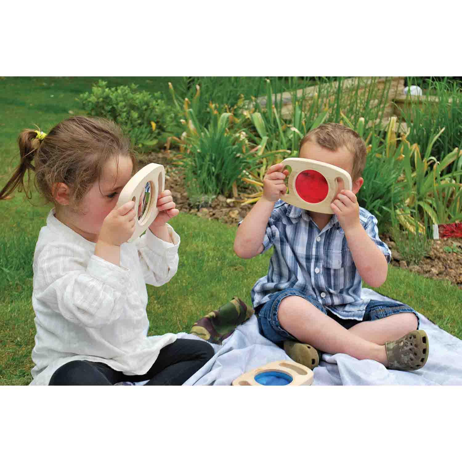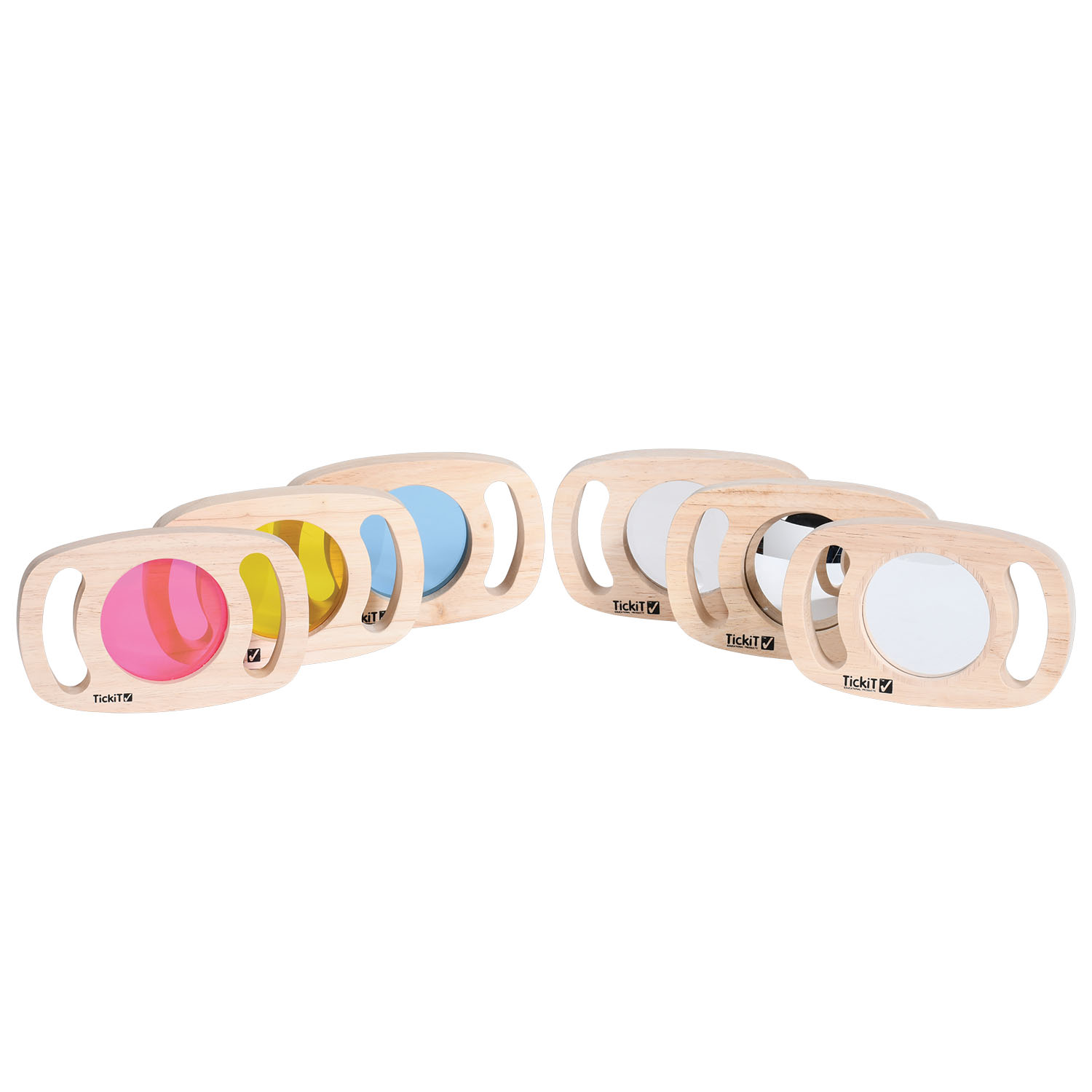 Discover a world of color and light with 3 colored acrylic lenses, a magnifying lens, a two-sided convex/concave mirror and a plane mirror. Use for indoor/outdoor color exploration or on a light table.