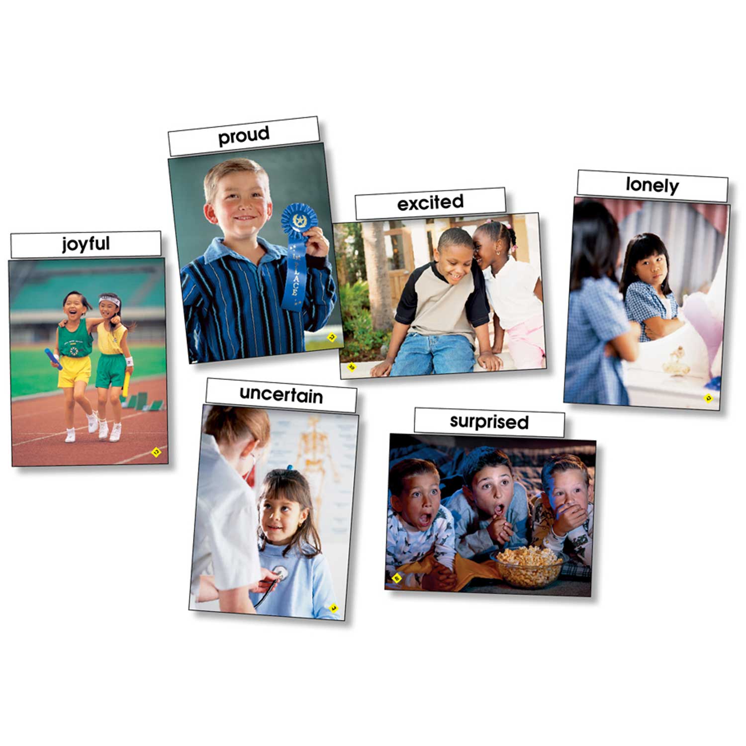 Help students of all ages recognize and understand the subtleties of human emotion while expanding their oral and written language skills. Expressive, two-sided photo cards capture familiar childhood emotions. The set also includes related emotion word cards to facilitate interactive classroom exercises and help build vocabulary.