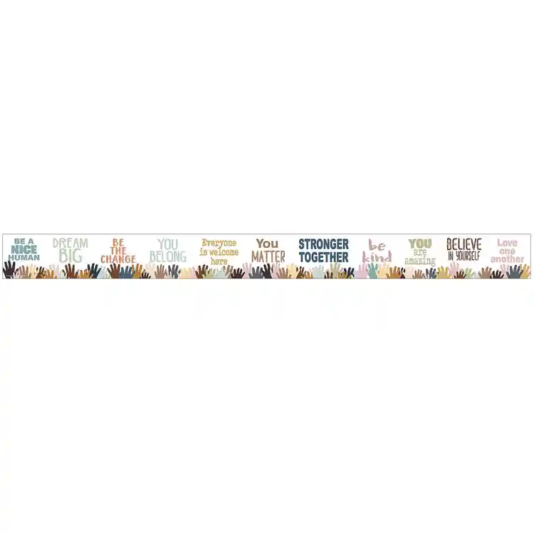 The soothing colors and positive messages on the Everyone is Welcome Helping Hands Border will inspire calm in your classroom. Use this trimmer to create displays on bulletin boards, windows, walls, and class projects.