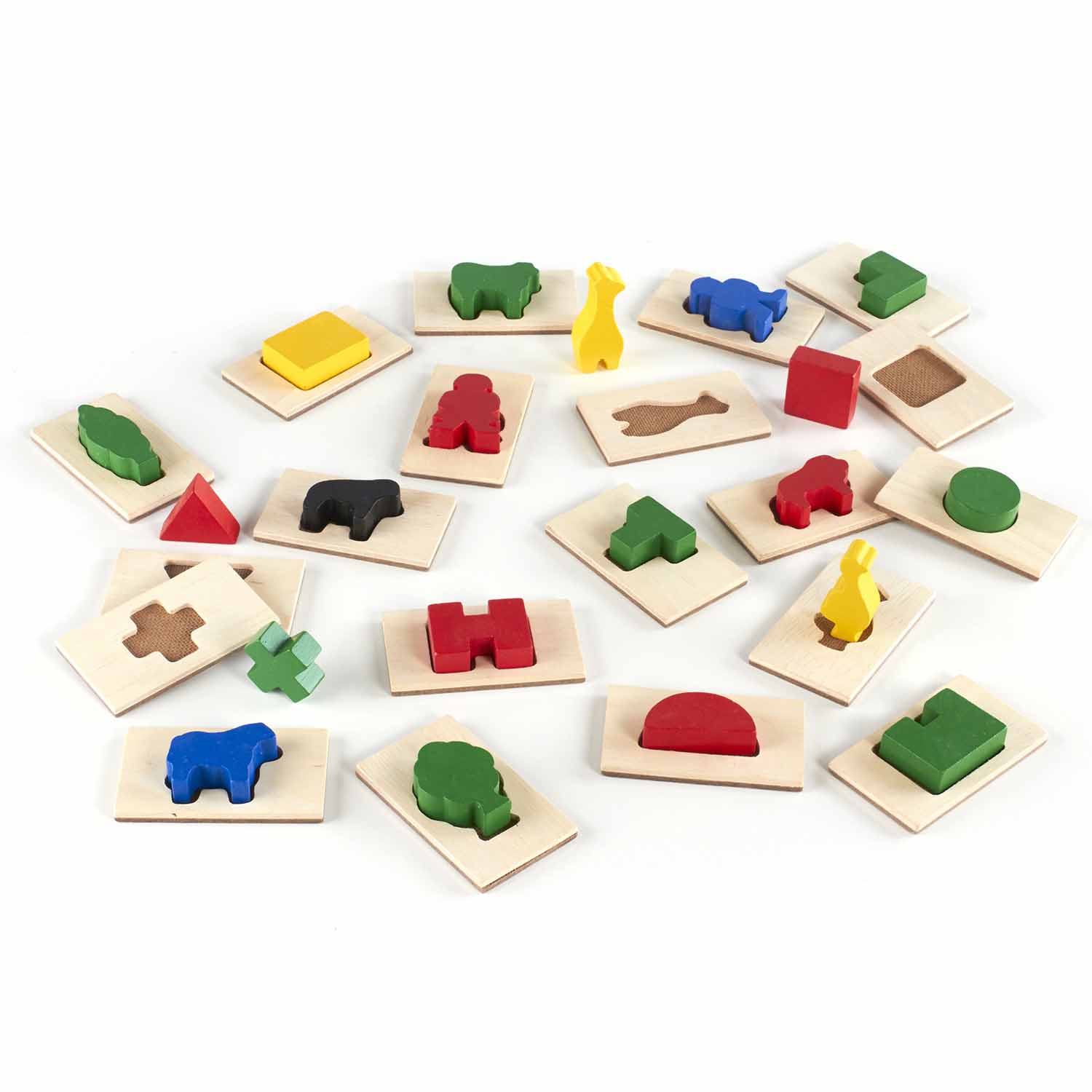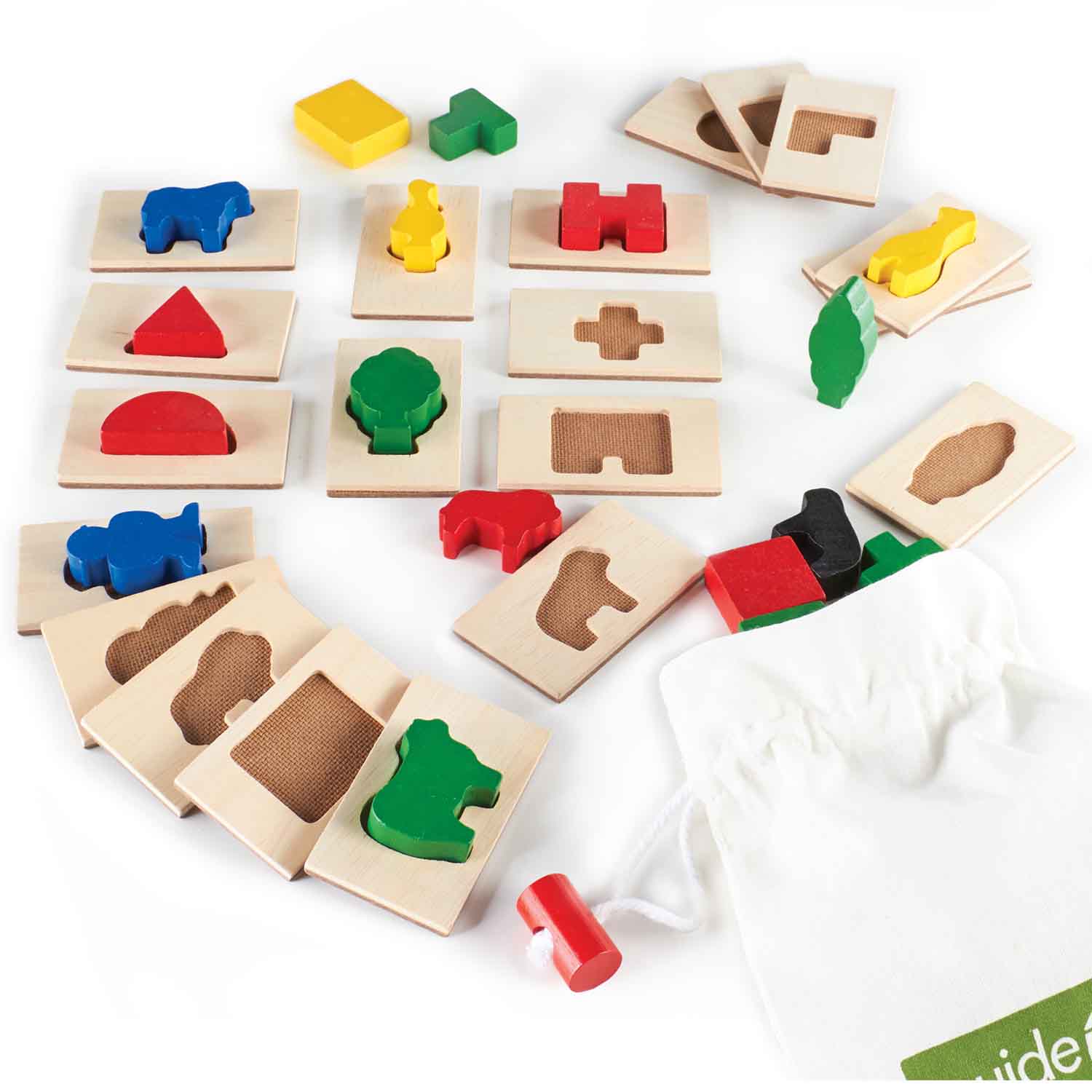 - Includes 22 colorful shapes with 22 matching tiles in a drawstring bag