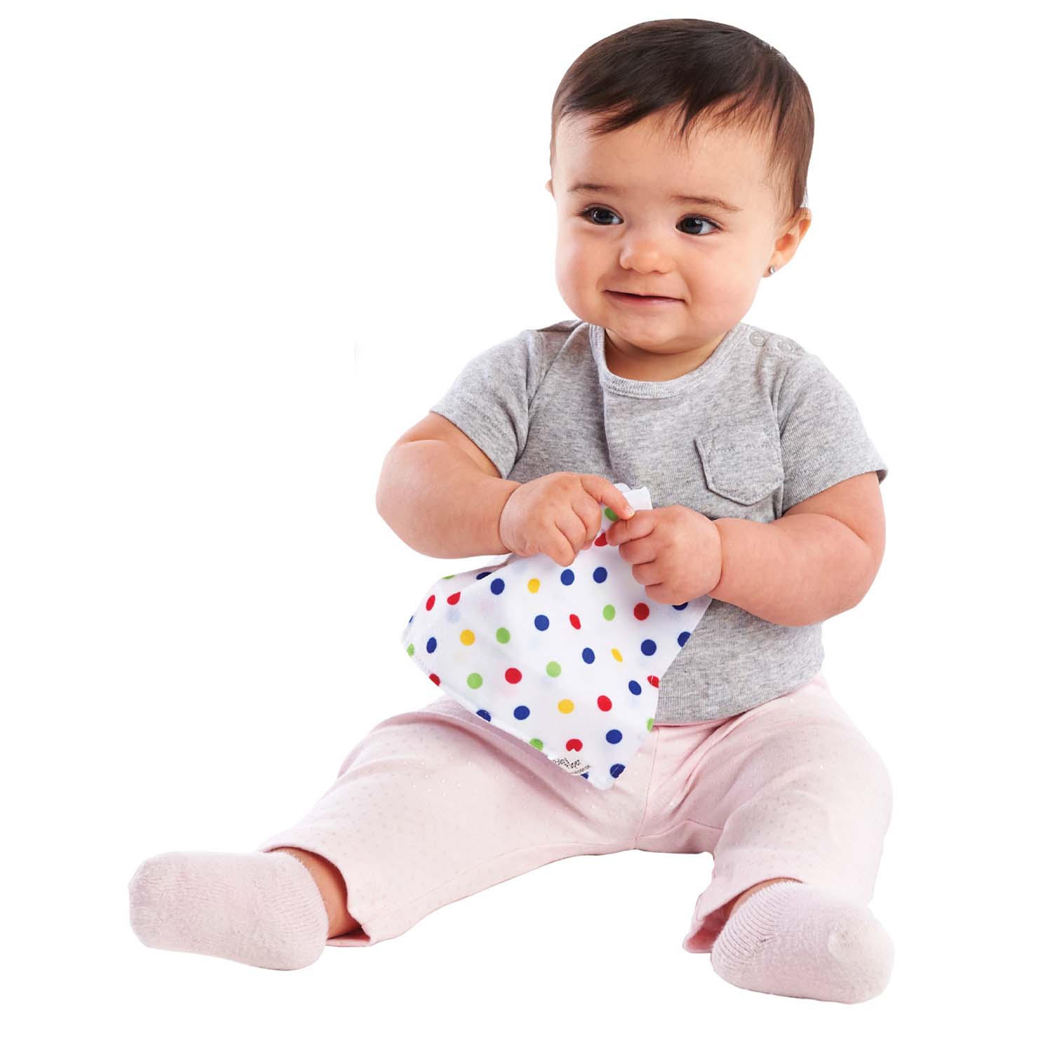 These fabric pieces are filled with material that sounds like paper, crinkles like paper, but doesn't rip like paper! It's soft to the touch and delights all of the baby's senses. Great for children with autism, too.