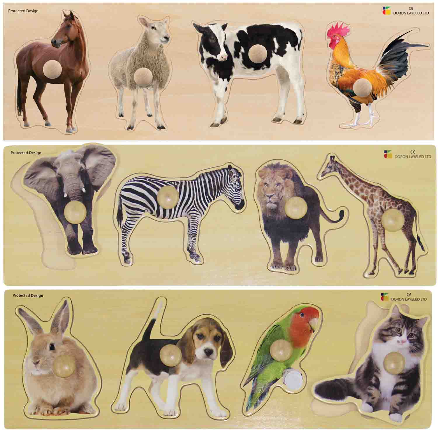 Designed for beginners and children with special needs, these puzzles have large animal pictures and extra large wooden knobs for easy removal and placing. Children use visual perception to match items by shape.