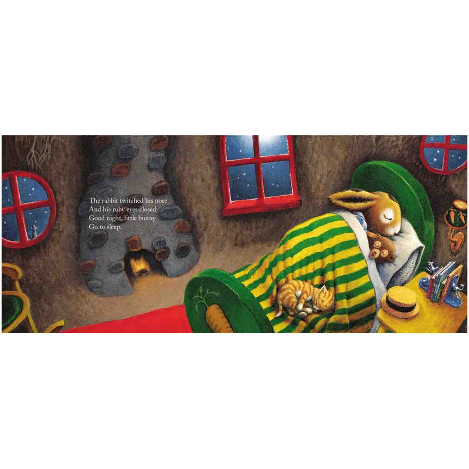 When the sun comes up and the day begins, the little bunny says good day to all the familiar things outside. To the birds in the skies and the bees in their hives, to everything one by one. And as the sun starts to set, it’s time for the little bunny to say goodnight. Goodnight, kitty. Goodnight, bear. Goodnight, people everywhere.