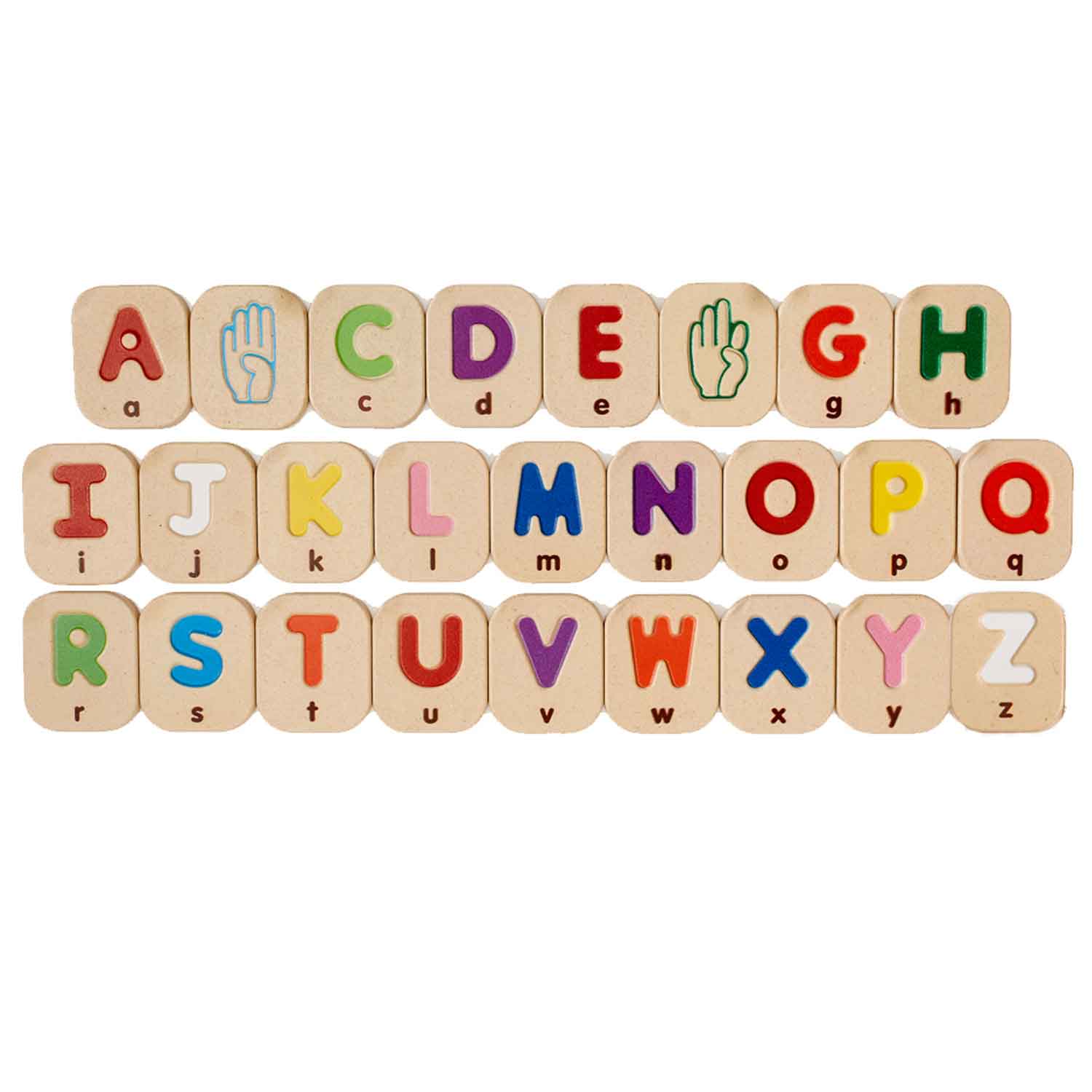 Beautifully crafted wooden shapes for tactile learning at a bargain price. One side has deep impressions for letters and the reverse side shows the matching American Sign Language symbol.