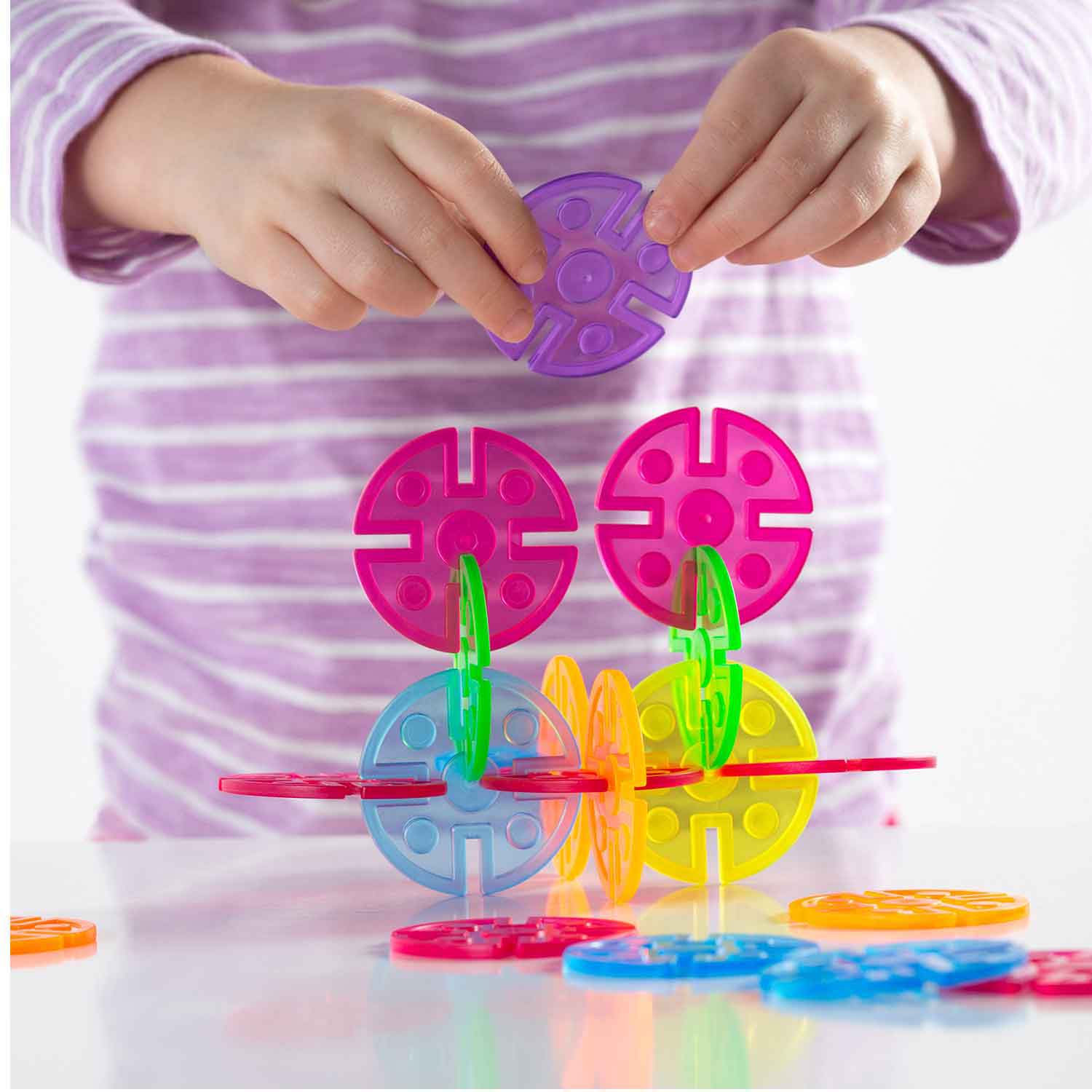 Interlox Discs provide colorful, easily interlocking building pieces to engage children in open-ended play. Discs are made of colorful, translucent plastic with multiple notches for flexible building. Children explore the concepts of symmetry and asymmetry while strengthening their design, structure and engineering skills. Use with the original Interlox panels for even more combinations.