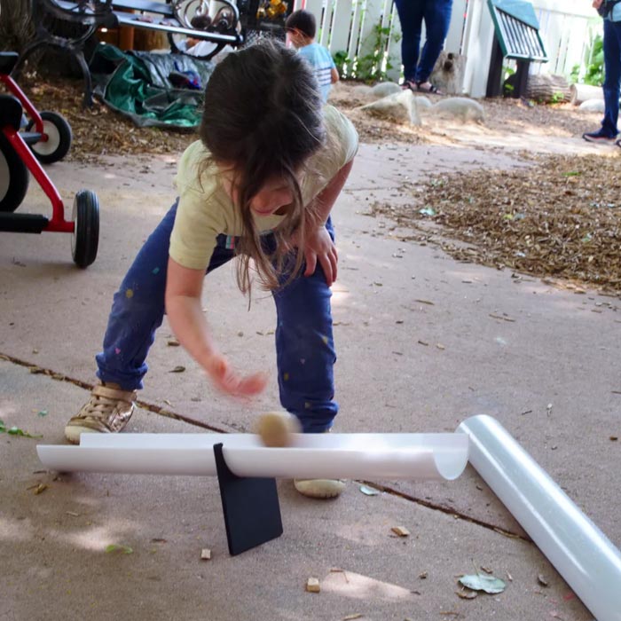 This multi-functional set of ramps and fulcrums can be used indoors, outdoors, or in any open area. Invite children to select the play props (e.g., cars, balls) and natural materials (e.g., sand, acorns, water) to enrich the discoveries.