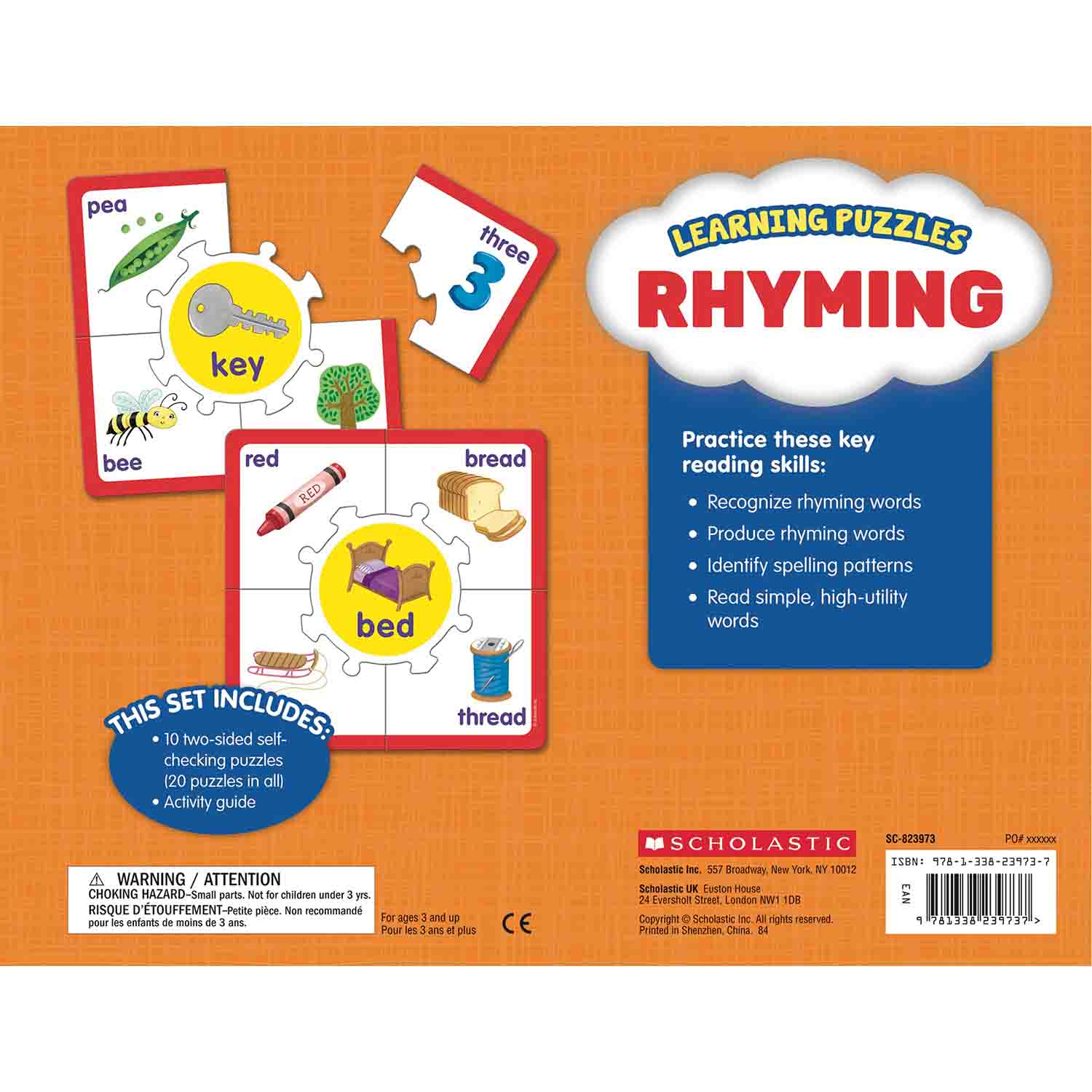 Here's a fun way to teach and reinforce phonemic awareness! The 20 self-checking, 5-piece puzzles in the set are designed to help children recognize and generate rhyming words. Each puzzle is unique-great for self-checking-and features a target word at the center and four rhyming picture/word puzzle pieces!