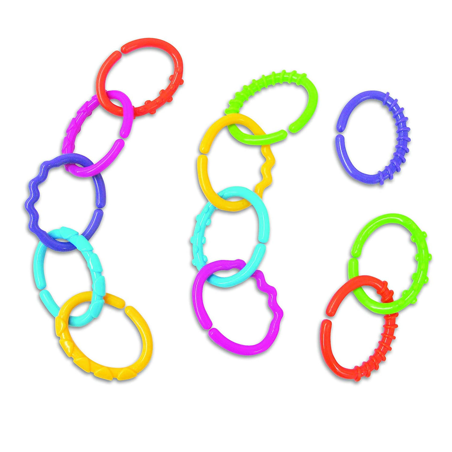 Multi-colored linkets are bumpy, lumpy and squiggly. The soft and flexible plastic links connect together, enhancing creativity, hand-eye coordination and fine motor skills.