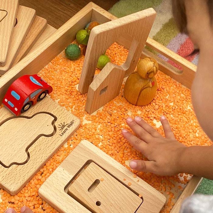 Support shape recognition, tracing, and sensory exploration with four beechwood frames designed for filling, outlining, and light table discovery. Encourages observation, fine motor development, and creative investigation with loose parts. Includes house, door, keyhole, and car shapes.