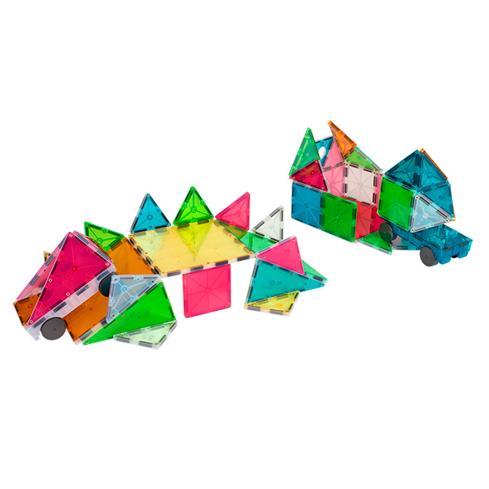 This racing-inspired set is ready to zoom into your room! Includes a mix of classic geometric shapes, two wheeled chassis and unique frost colors that will put your MAGNA-TILES® collection in overdrive. All pieces are compatible with all other MAGNA-TILES® sets.