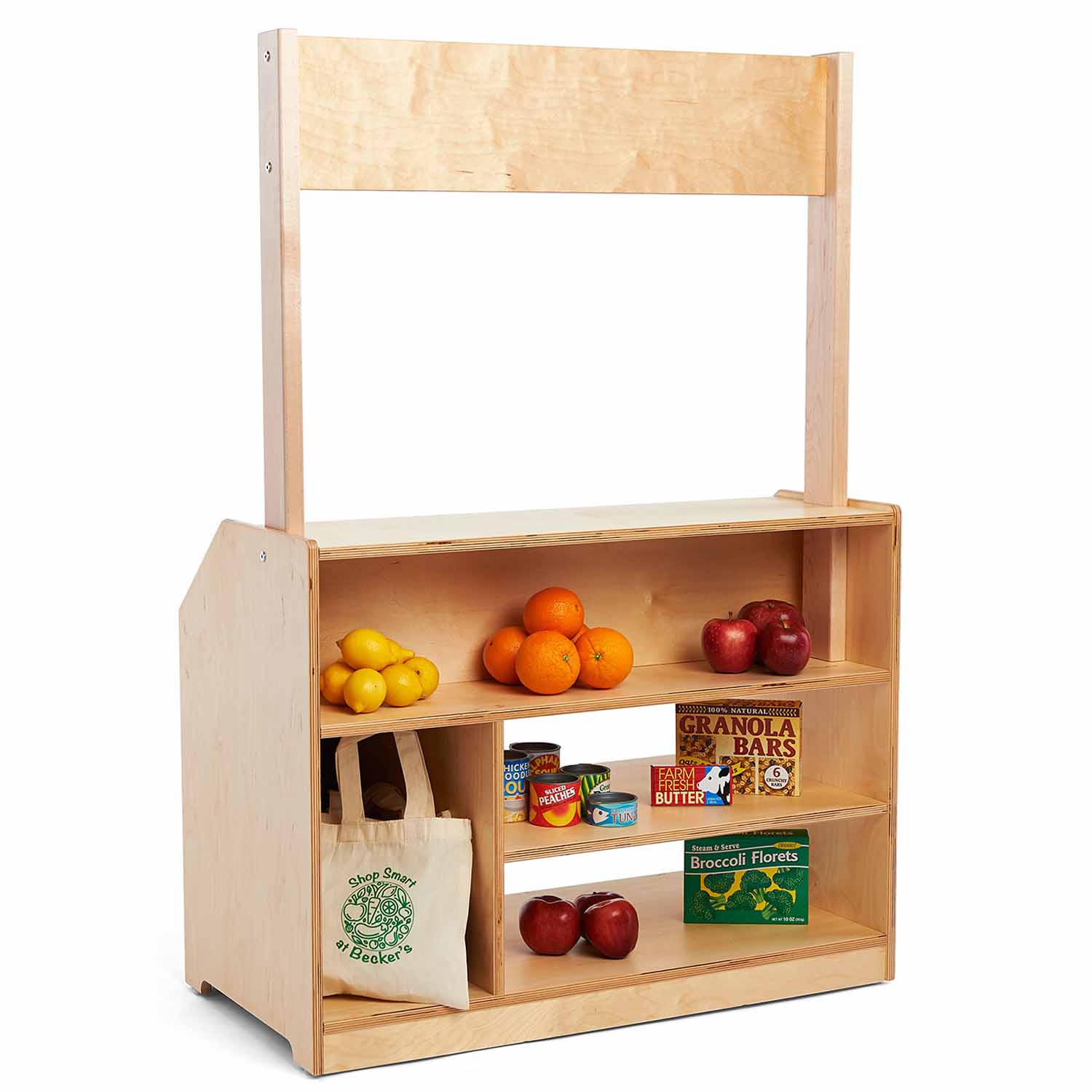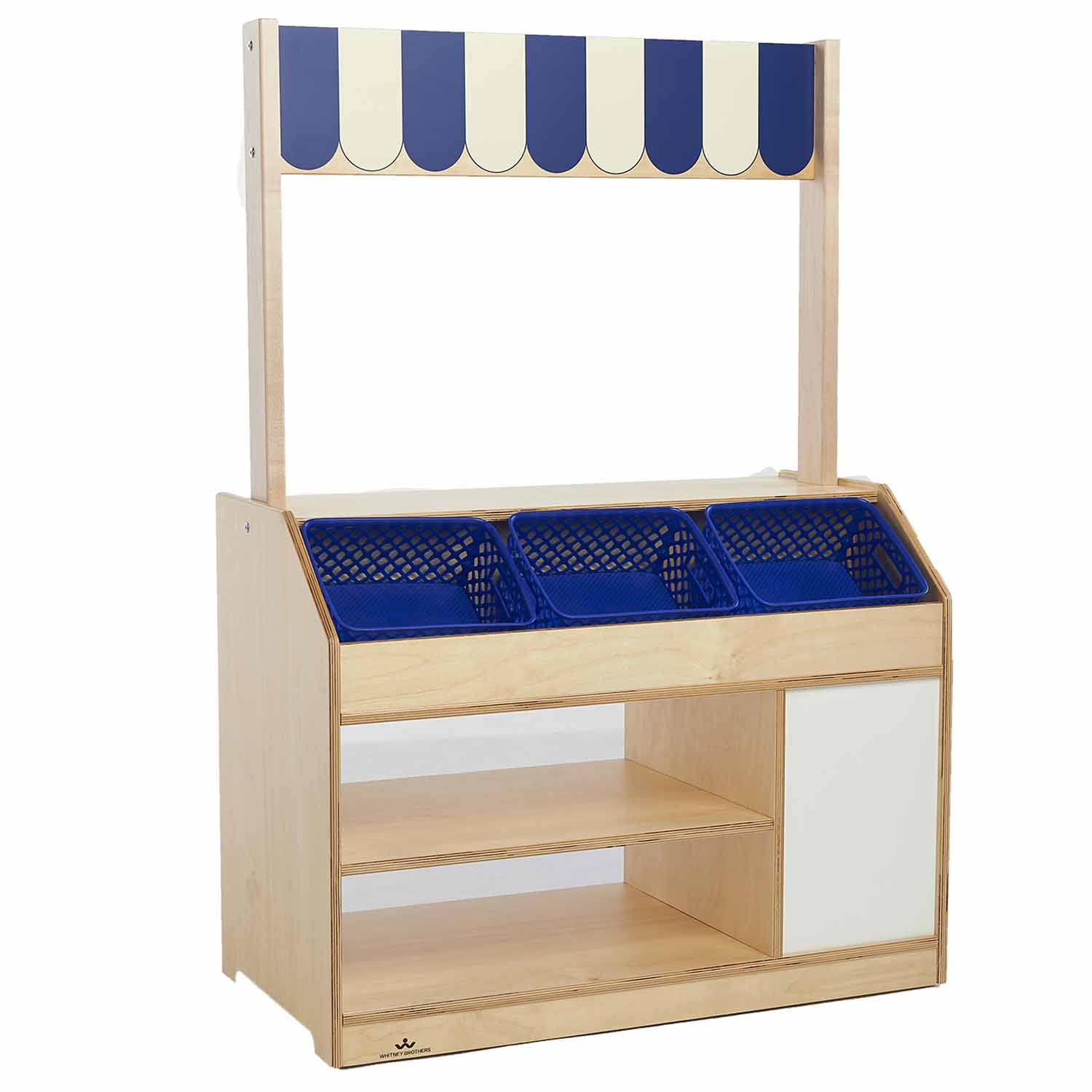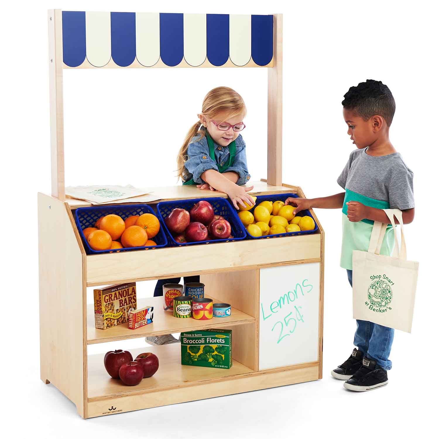 This cute market stand features a colorful awning and lots of space to store and display items. The top shelf holds three plastic bins to feature your fresh produce! Be sure to let customers know about daily specials on the dry-erase board. There is also additional storage in the back of the unit.