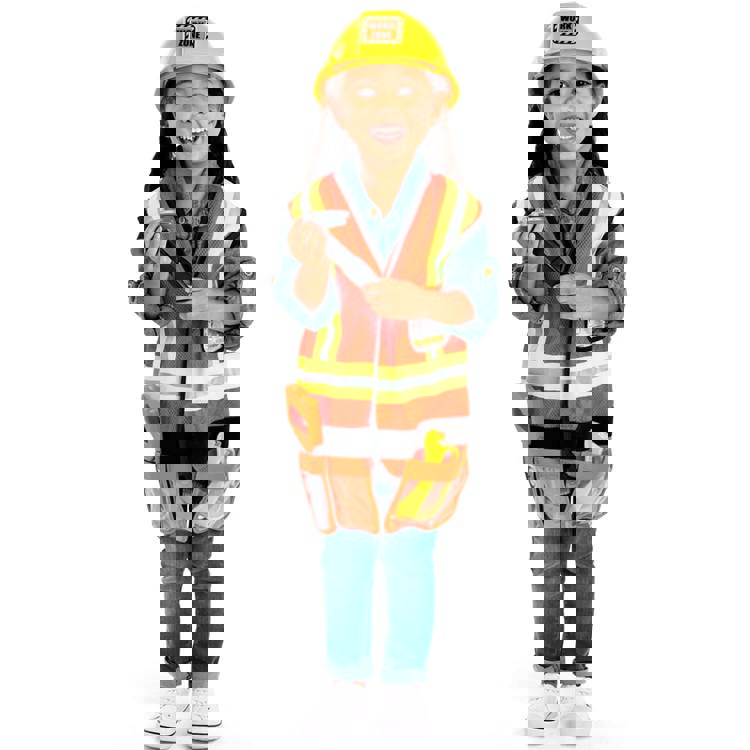 - Includes vest, tool belt with tools, hard hat, safety goggles and name tag