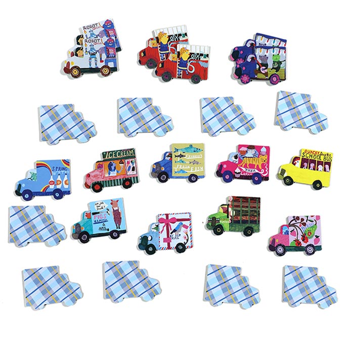 - Includes 24 playing pieces shaped like trucks (and one bus!)