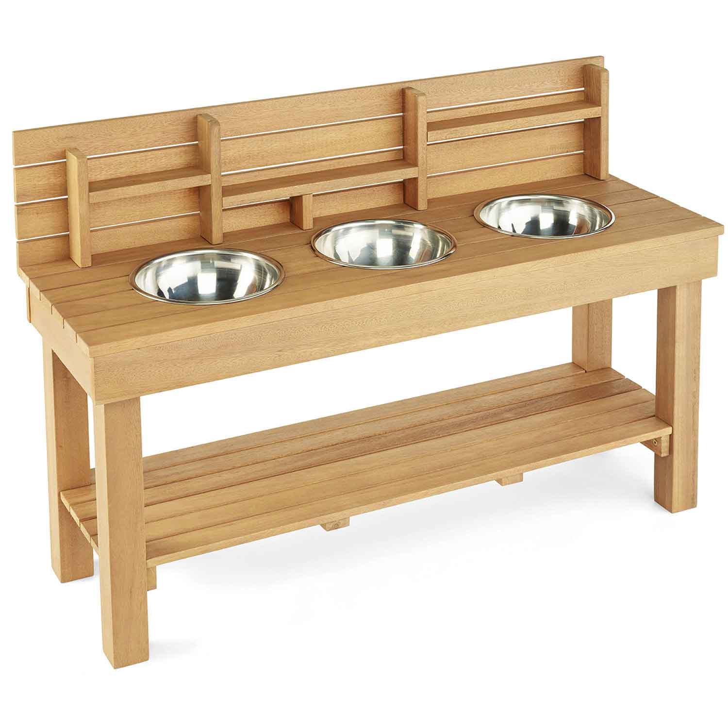 Encourage hours of open-ended creative play outside with this mud kitchen. Made of solid eucalyptus, it features three stainless steel bowls plus attractive shelf storage for accessories. Boost imagination, communication and social development through fun role play outdoors!
