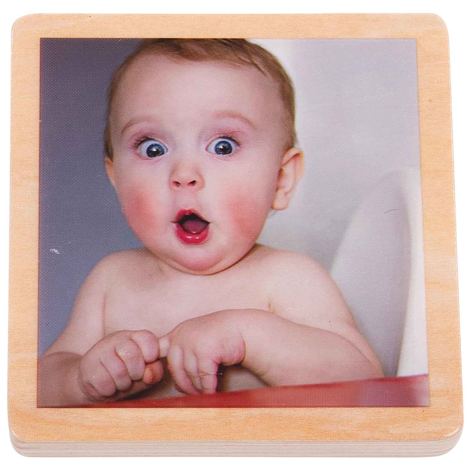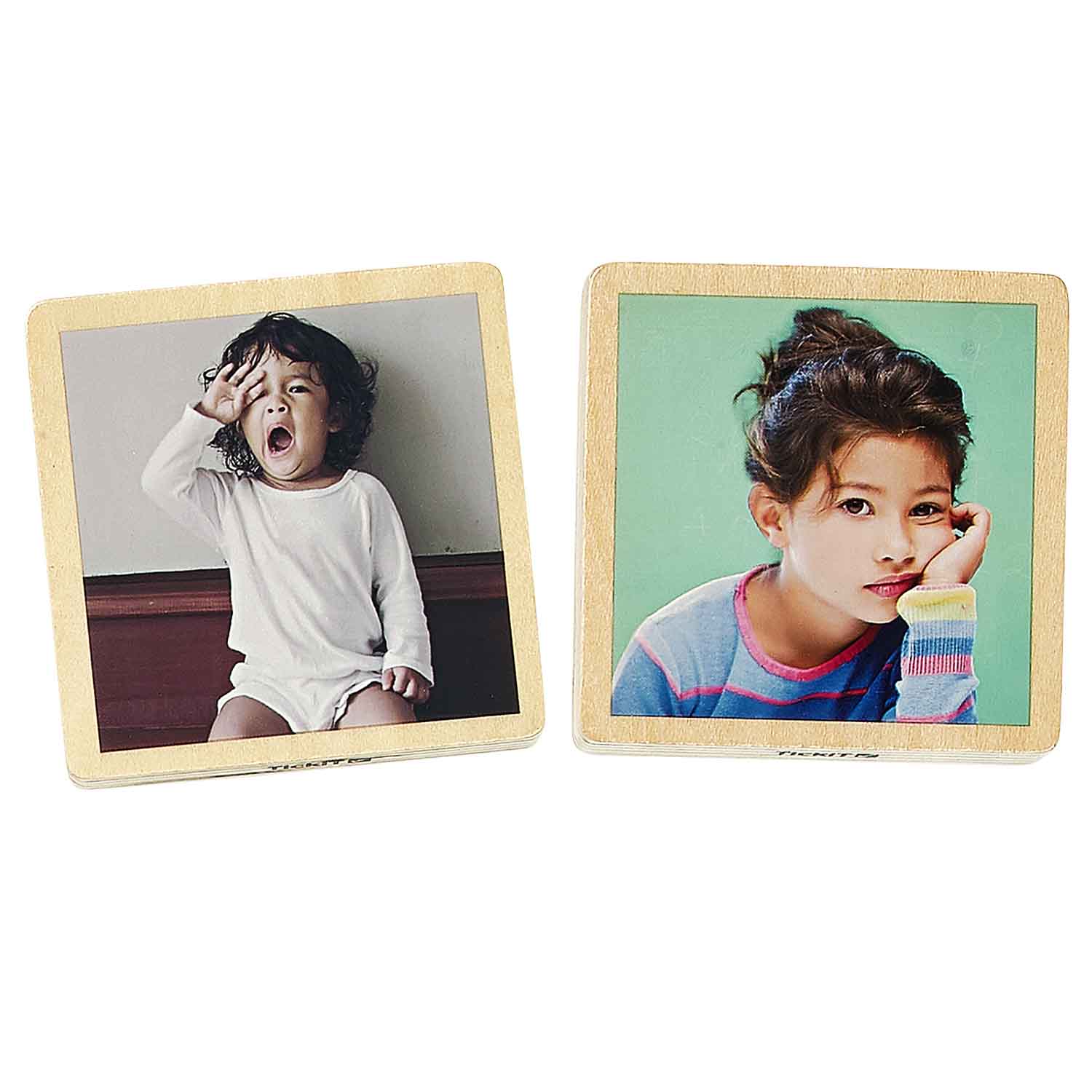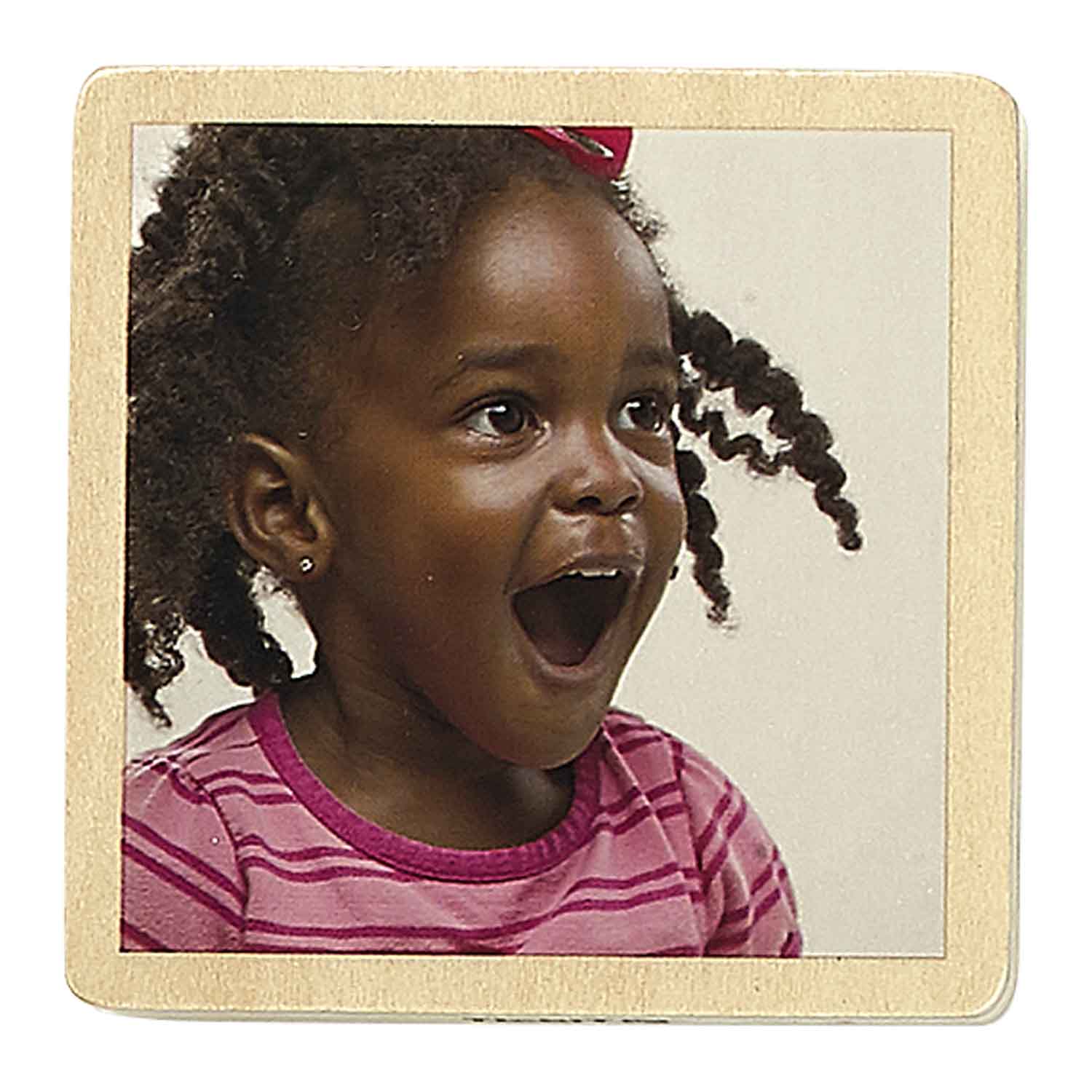 These wood tiles show diverse photos of children with a variety of emotions and expressions. The chunky tiles are printed on one side and self-stand. Each tile is smooth to touch.