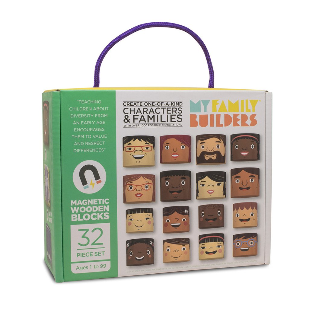 Create your own combination of family and friends with MyFamilyBuildersâ„¢ wood-crafted magnetic block sets. Celebrate diversity with figures that show a variety of skin tones and facial features. Just choose a head, body, and legs - the magnets hold the pieces together securely!