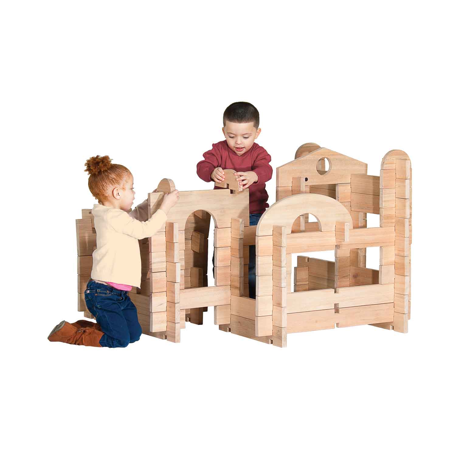 These eucalyptus wood blocks feature smooth sanded edges and notches that lock together to allow for easy open-ended construction. They're great for indoor or outdoor use! With blocks of varying shapes and sizes, there are plenty to share which encourages group participation.
