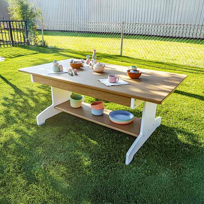 The outdoorED™ Table combines a modern look with practical features. It has a handy storage shelf for supplies and sturdy, sculpted legs that give kids plenty of space. Built from tough woodgrain maple and HDPE thermoplastic, this table stands up well to outdoor use. The UV-stabilized surface helps prevent fading, stains, and mold, so it's easy to keep clean.
