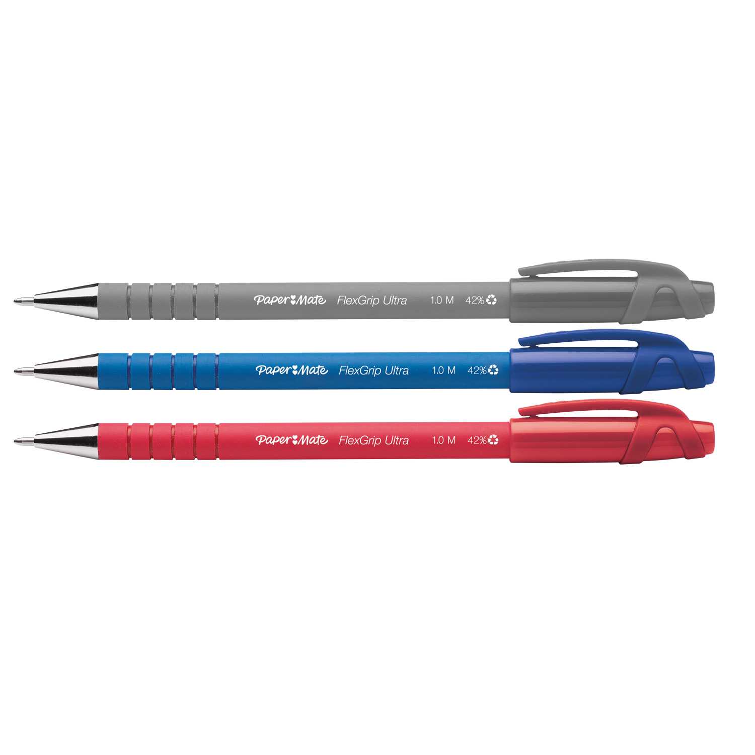 Papermate® Flexgrip Pen. Rubberized barrel with ringed grip area and durable arrowhead ball point. Colored barrel, chrome tip. Fine point.