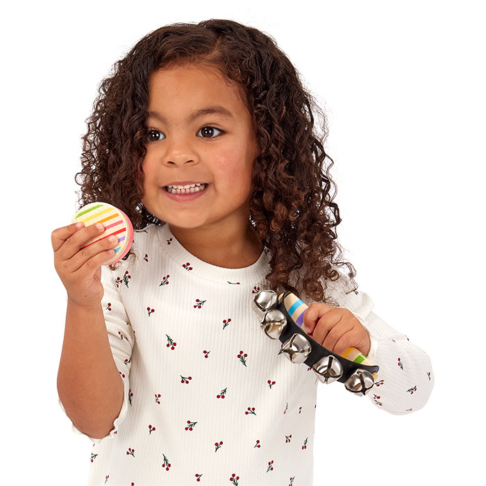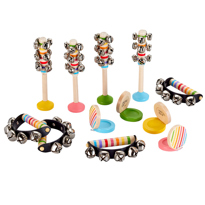 - Includes 4 Bell Sticks, 2 Pairs of Castanets, and 2 Pairs of Handbells