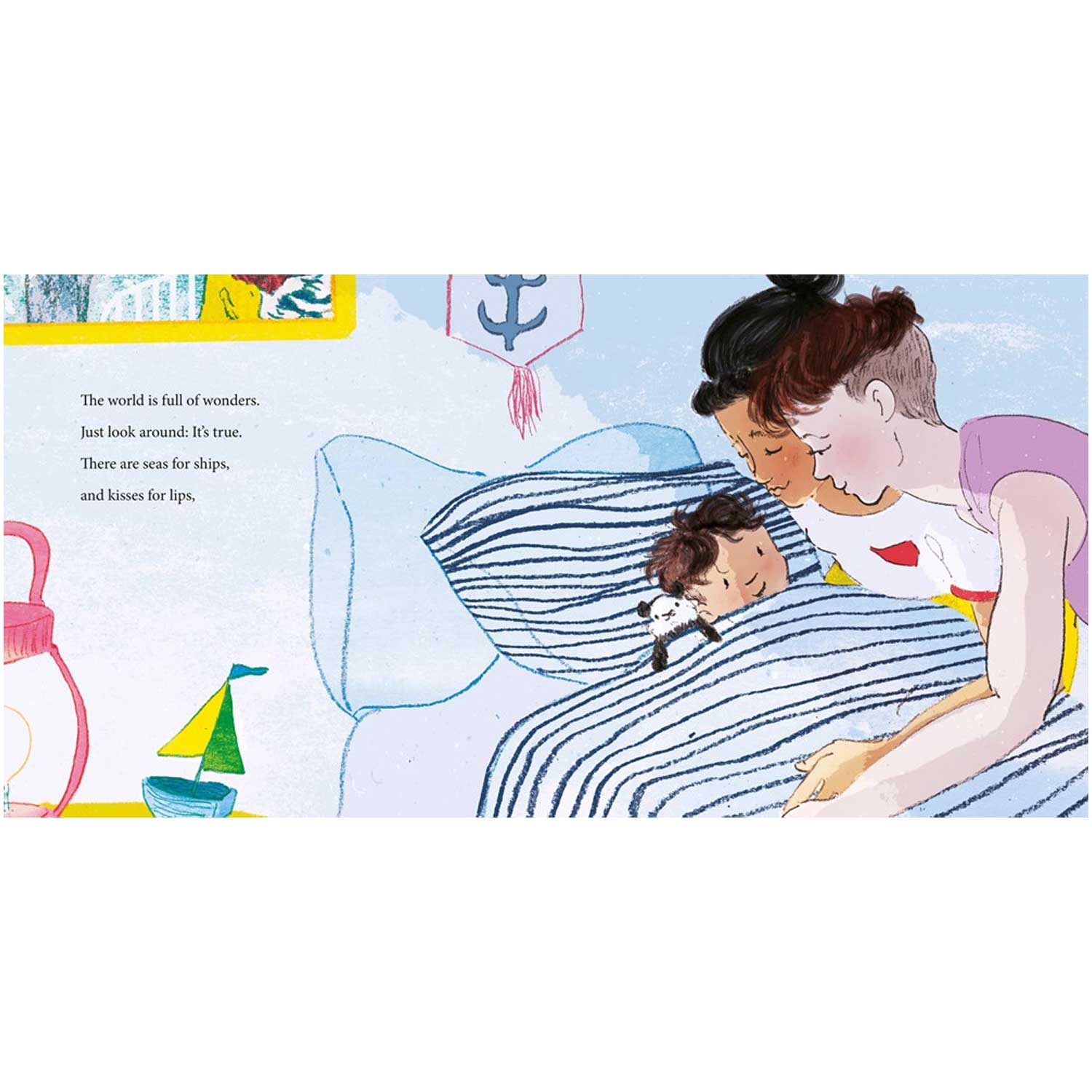 Two mommies spend a sunny day with their toddler in this cozy, rhyming picture book that is a loving celebration of family. This cheerful book follows a family from morning to night in lively rhyme that rolls off the tongue. There's a buzz for each bug, and a breeze for each tree, and plenty of hugs for you and me. The toddler and mommies take a morning bike ride to a farm stand, they visit a zoo in the afternoon, and in the evening there's the bath and storybook routine before the child is tucked cozily into bed. There are seas for ships and kisses for lips, so we can whisper I love you!