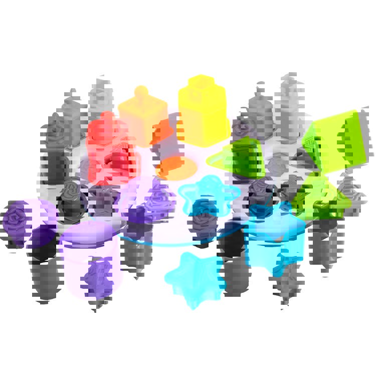 Have a sensory, shape sorting experience! Each silicone shape has a unique textured design and the pieces fit together in multiple ways Includes 6 shapes and matching plugs: star, circle, square, diamond, hexagon and triangle.