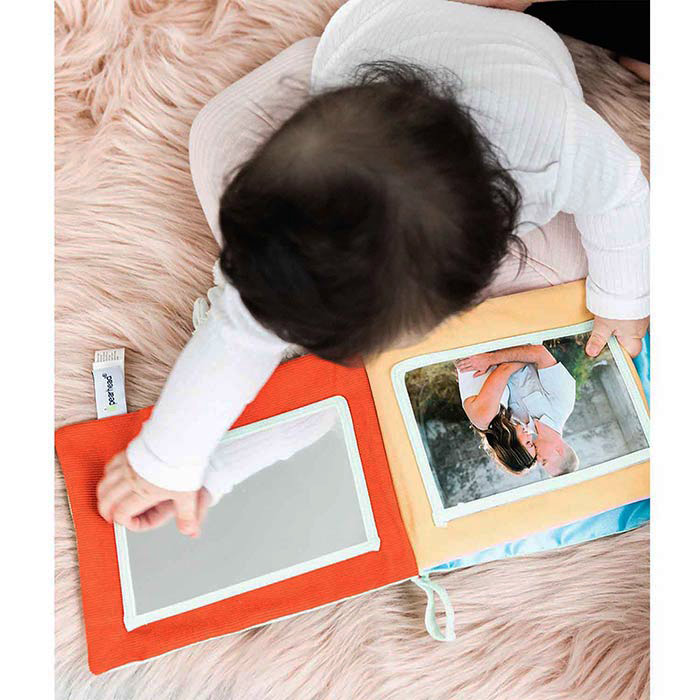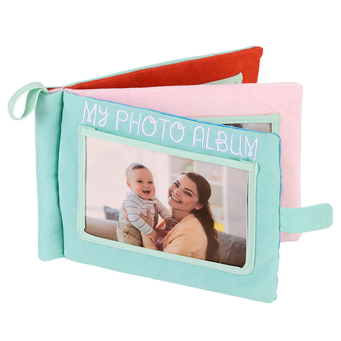 Perfect first book for infants. Soft photo book with four plastic sleeves to hold 4" x 6" photos of family members, animals, colorful images and much more.