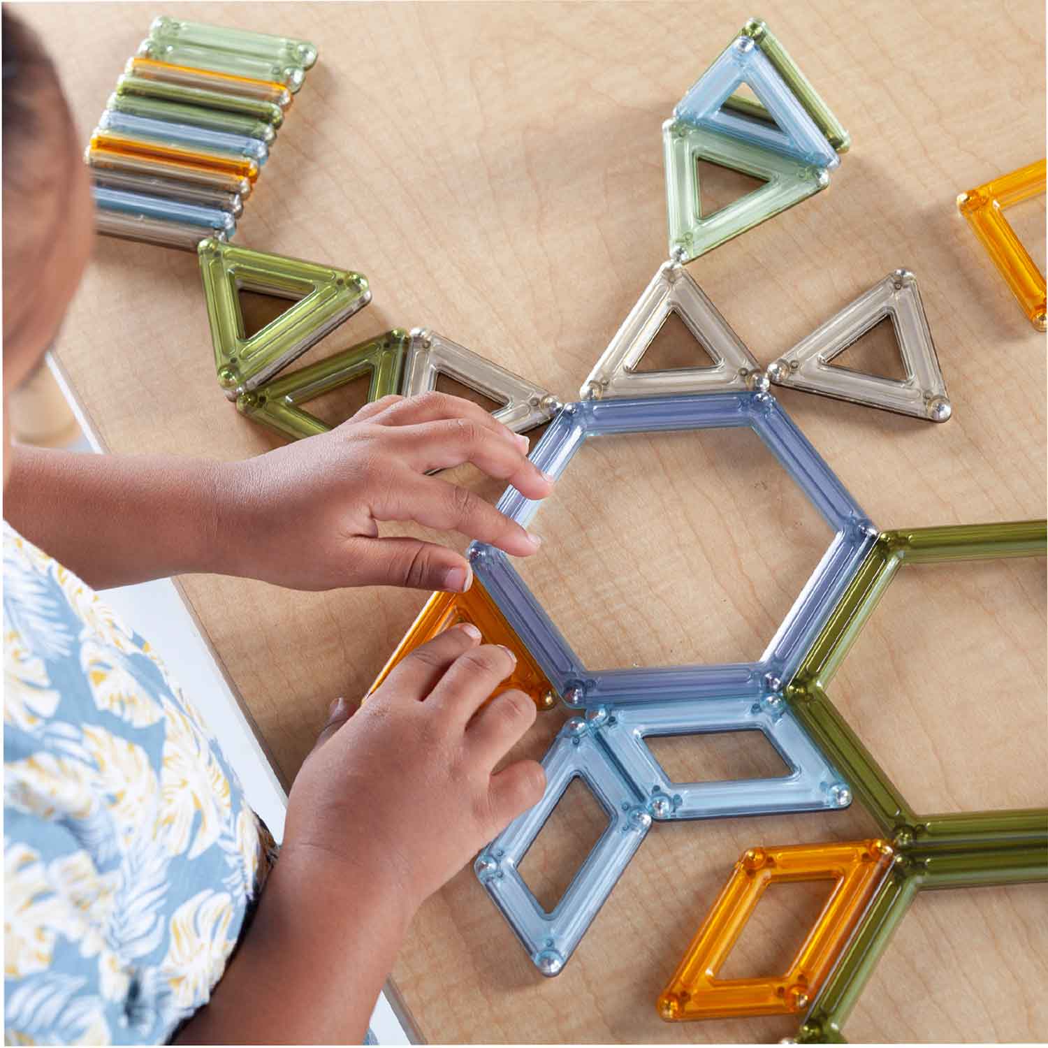 These open-ended magnetic construction sets integrate elements of natural play and loose parts theory. They feature natural-colored panels in translucent ABS plastic with neodymium magnets. Each set includes 10 double-sided creativity cards. Packaging features a metal plate to store and organize easily or as a base for builds.