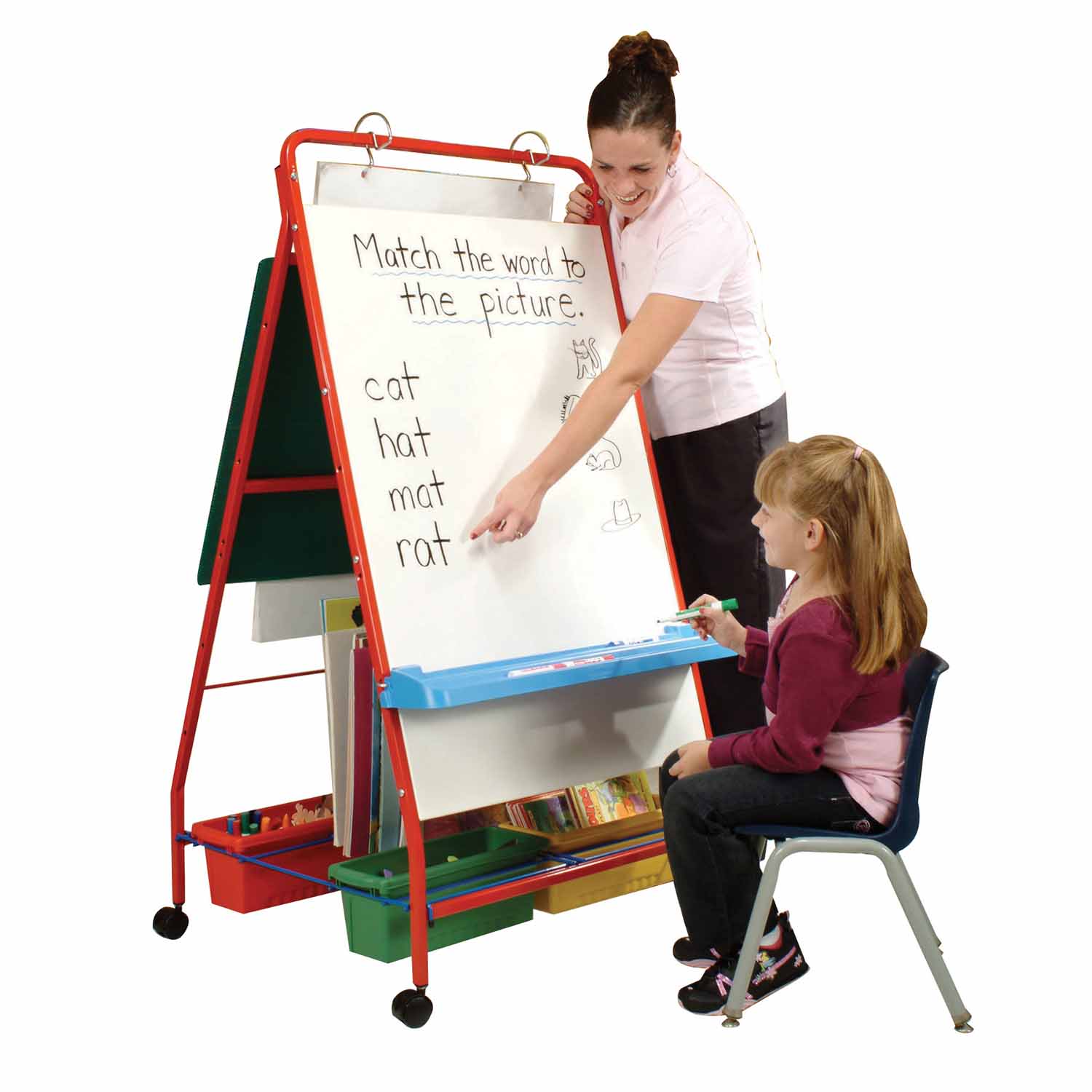 Our new multi-use early childhood easel features a magnetic dry erase front that also supports big books, chart pads, and pocket charts. Included is a 24" x 32" removable felt board and a 4 tub, big book storage rack. Casters and marker ledge included.