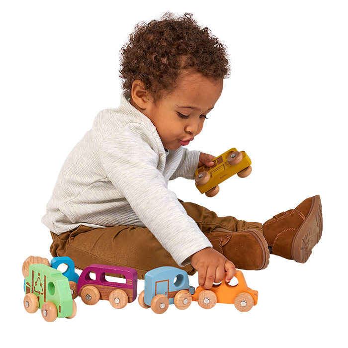The Rainbow Wooden Vehicles set includes 12 solid beechwood vehicles with rotating wheels and metal axles. Each piece is lightly stained with colored paint to promote calm. Use this set to introduce different forms of transport and the roles they play. The easy-to-grip, chunky cars are easy for small hands to grasp.