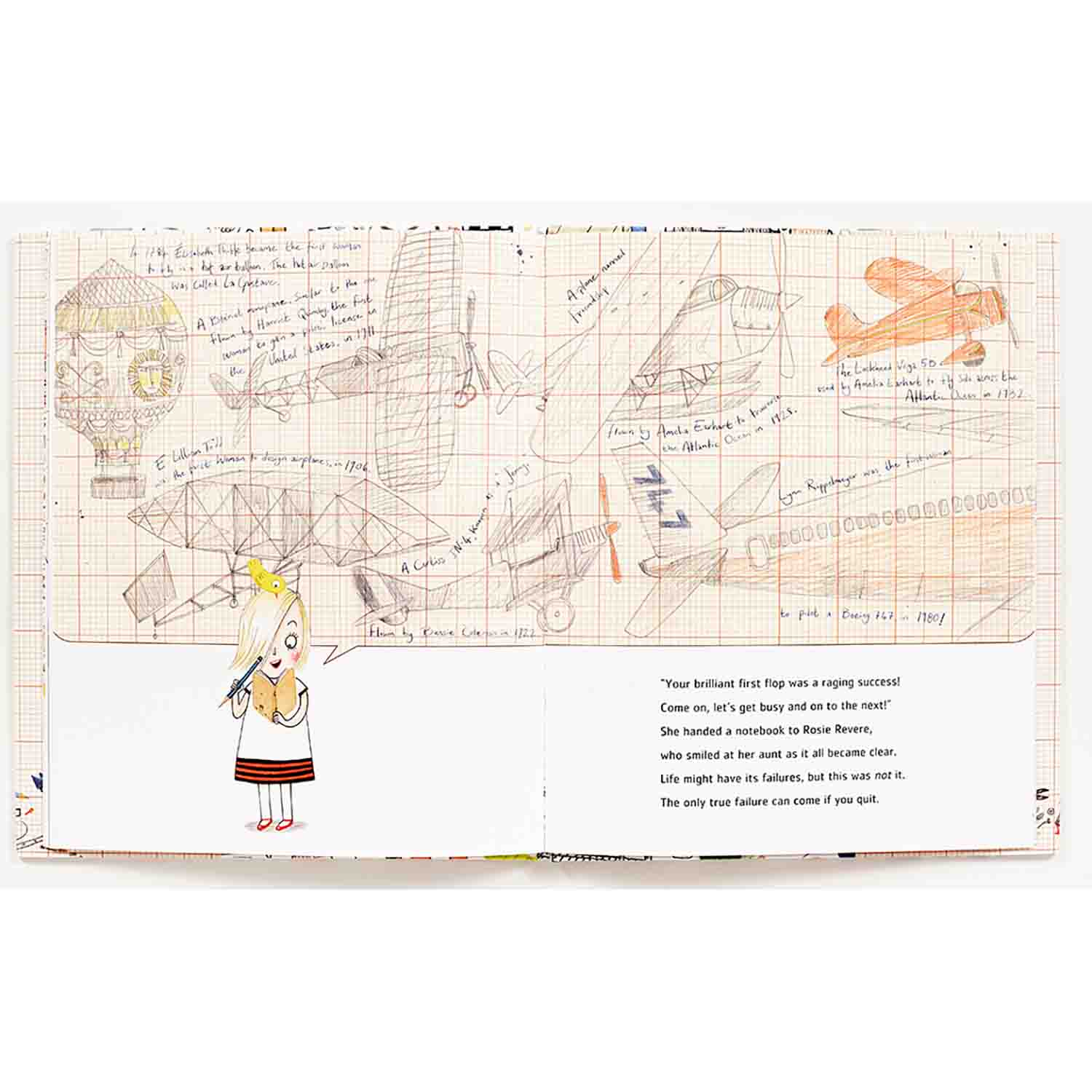 Rosie may seem quiet during the day, but at night she's a brilliant inventor of gizmos and gadgets who dreams of becoming a great engineer. When her great-great-aunt Rose (Rosie the Riveter) comes for a visit and mentions her one unfinished goal - to fly - Rosie sets to work building a contraption to make her aunt's dream come true. But when her contraption doesn't fly but rather hovers for a moment and then crashes, Rosie deems the invention a failure. On the contrary, Aunt Rose insists that Rosie's contraption was a raging success: you can only truly fail, she explains, if you quit.