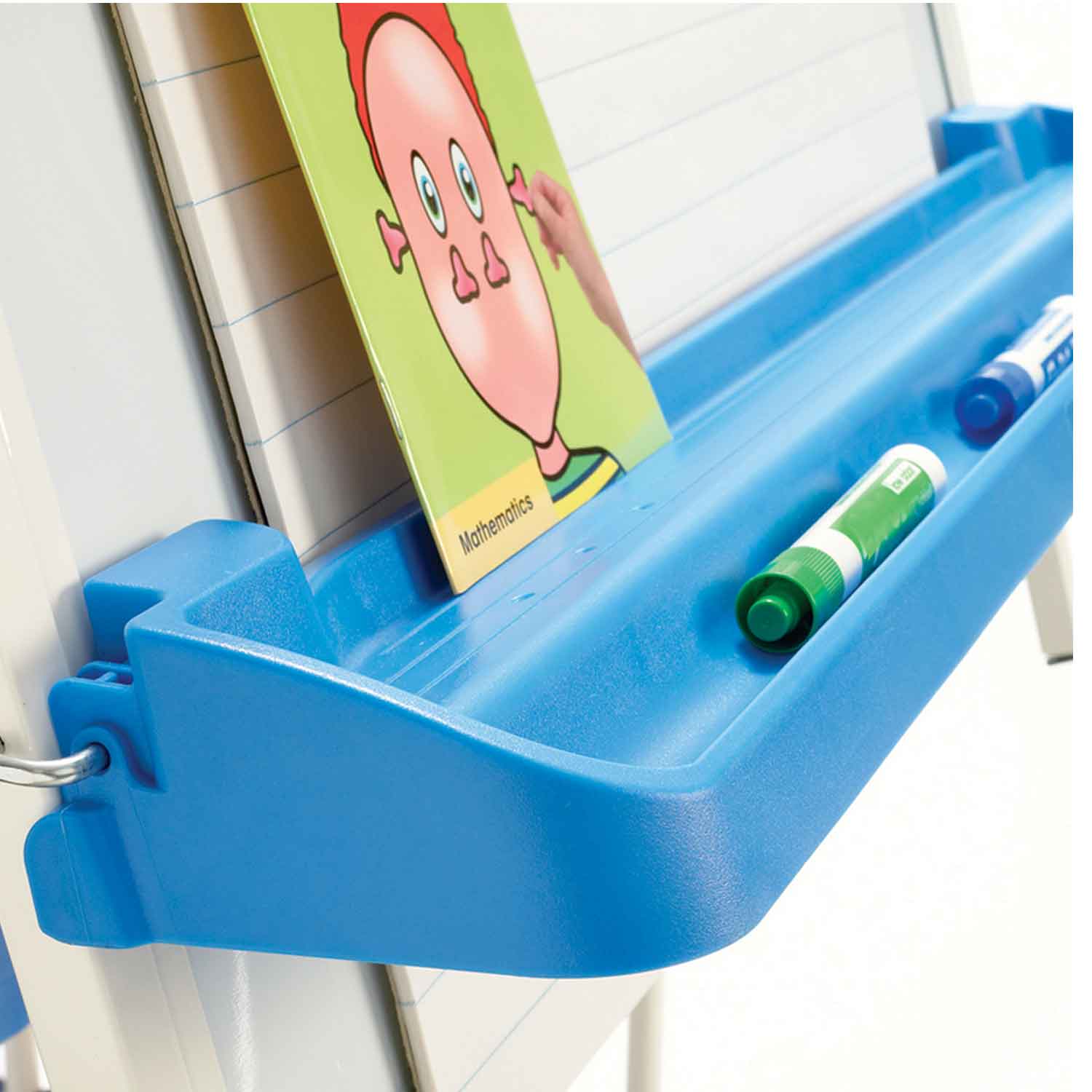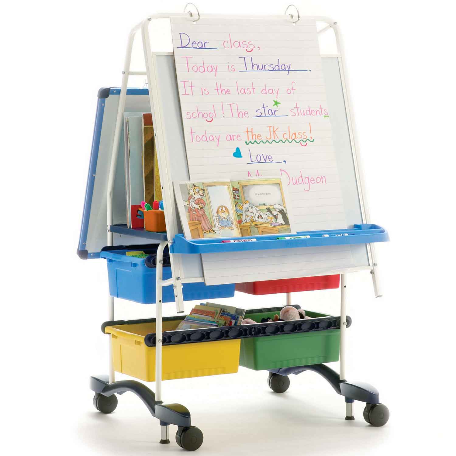 The design of this award-winning classic Royal Reading/Writing Center was inspired by teachers. It has a magnetic dry-erase board and removable, lined dry-erase board. Features sliding open tubs with safety stops, 3" casters, foot brake, big book rack and an Ultra-Safe premium book ledge that locks into multiple positions.
